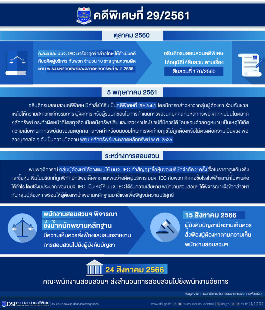 วันพฤหัสบดีที่ 24 สิงหาคม 2566 : กรมสอบสวนคดีพิเศษ โดย กองคดีการเงินการธนาคารและการฟอกเงิน ได้นำสำนวนคดีพิเศษที่ 29/2561 กรณี สำนักงานคณะกรรมการกำกับหลักทรัพย์และตลาดหลักทรัพย์ (สำนักงาน ก.ล.ต.) และบริษัท อินเตอร์แนชั่นเนิลเอนจีเนียริง จำกัด (มหาชน) (IEC) ร้องทุกข์กล่าวโทษให้ดำเนินคดีกับอดีตผู้บริหาร บมจ. IEC กับพวก รวม 10 ราย ส่งพนักงานอัยการ สำนักงานคดีพิเศษ สำนักงานอัยการสูงสุด