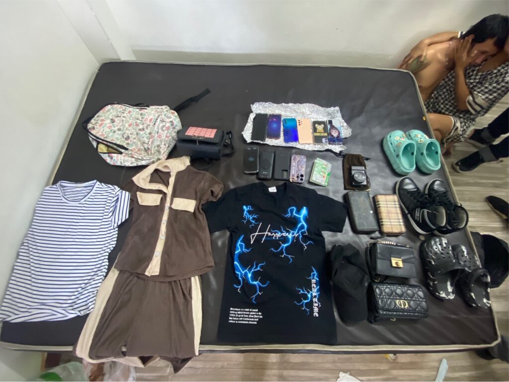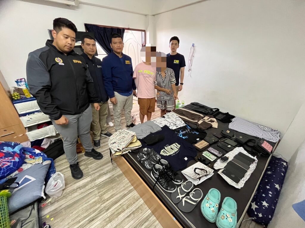 นำกำลังสืบสวนติดตามจับกุมตัว นายบูย หรือบอย ยางฮา อายุ 31 ปี สัญชาติกัมพูชา และ นางสาวแมรี่ หรือส้ม จีน อายุ 27 ปี สัญชาติกัมพูชา ในข้อหา “เป็นบุคคลต่างด้าวเดินทางเข้ามาและอยู่ในราชอาณาจักรโดยไม่ได้รับอนุญาต” พร้อมของกลางโทรศัพท์มือถือที่ลักทรัพย์มา และชุดที่ใช้ในการก่อเหตุรวมกว่า 36 รายการ