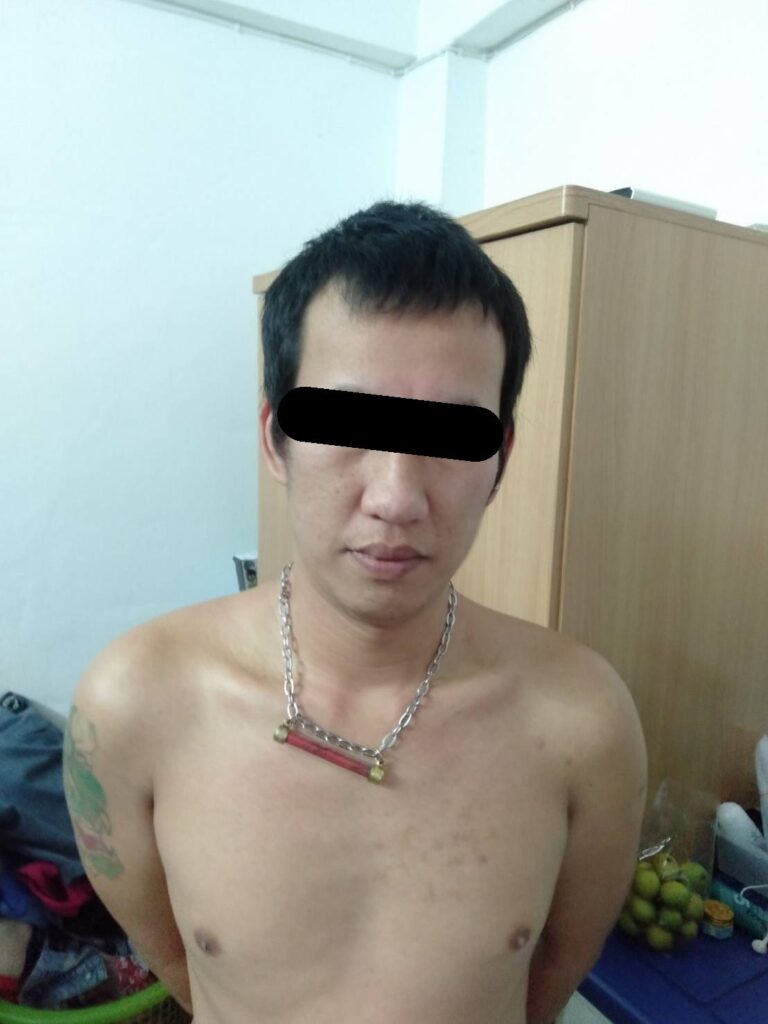 โดยสามารถจับกุมตัวได้ที่บริเวณหน้าห้องพักเลขที่ 310 อพาร์ทเม้นทรัพย์เอเชีย ซอยสุขุมวิท 111 ตำบลสำโรงเหนือ อำเภอเมือง จังหวัดสมุทรปราการ พร้อมของกลางโทรศัพท์มือถือที่ลักทรัพย์มา และชุดที่ใช้ในการก่อเหตุรวมกว่า 36 รายการ