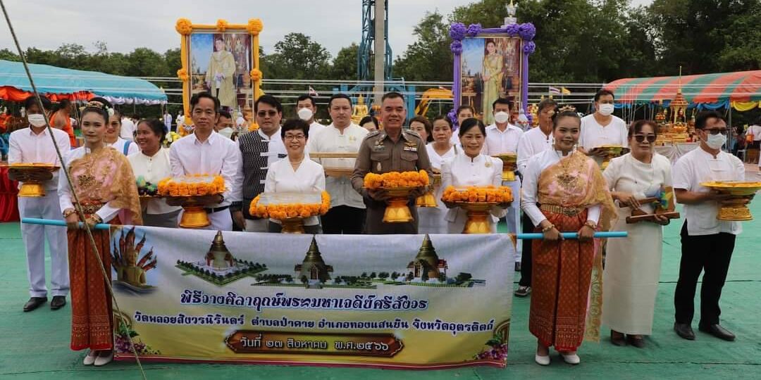 ที่วัดพลอยสังวรนิรันดร์ อำเภอทองแสนขัน จังหวัดอุตรดิตถ์ พระเทพวชิรเวที เจ้าคณะจังหวัดสุโขทัย พระเทพวัชิรวิสุทธิ์ เจ้าคณะจังหวัดหนองบัวลำภู พระราชวชิรากร เจ้าคณะจังหวัดอุตรดิตถ์ พระวินัยสาทร เจ้าคณะจังหวัดอุตรดิตถ์(ธ.)พระศรีปริยัติวิมล รองเจ้าคณะจังหวัดอุตรดิตถ์ เป็นประธานฝ่ายสงฆ์ในพิธีเจิมแผ่นวางศิลาฤกษ์และเจิมเสาเอกในการตอกเสาเอกพระเจดีย์ศรีสังวร โดยมีพระครูวิบูลสุตวัฒน์ วิ เจ้าอาวาสวัดพลอยสังวรนิรันดร์ พร้อมคณะสงฆ์ พร้อมนางณิรดา พรมสุวรรณ นายอำเภอทองแสนขัน พุทธศาสนิกชนได้ร่วมในพิธีวางศิลาฤกษ์พระเจดีย์ศรีสังวรณ์ในวันนี้สำหรับพระเจดีย์ศรีสังวรณ์ที่จัดสร้างมีขนาดกว้าง 55 เมตร ความสูง 38 เมตร บนเนื้อที่ 1 ไร่ครึ่ง ซึ่งได้มีขบวนแห่พร้อมนางรำจำนวน 200 คน แห่แผ่นศิลาฤกษ์ ค้อนไม้เพื่อแห่มายังสถานที่ที่จะก่อสร้างพระเจดีย์ศรีสังวรณ์ ในช่วงเช้าได้มีพิธีบวงสรวงเทพเทวา และในช่วงเวลา 10.09 น.พิธีแห่แผ่นฤกษ์ มายังบริเวณพิธีสถานที่ก่อสร้างพระเจดีย์ศรีสังวรณ์ พร้อมกันนั้นได้มีพิธีเจริญพระพุทธมนต์ พระสงฆ์ให้ศีล พระสงฆ์สวดชุมนุมเทวดาประธานทั้งฝ่ายสงฆ์และฝ่ายฆราวาส เจิมแผ่นฤกษ์ และตอกไม้มงคล วางแผ่นฤกษ์ อิฐเงิน อิฐทองลงในบ่อศิลาฤกษ์ พร้อมกันนั้นเจ้าหน้าที่ได้ทำการตอกเสาเข็มเสาเอกในการก่อสร้างพระเจดีย์ศรีสังวรณ์ พระสงฆ์เจริญชัยมงคลคาถา เป็นอันเสร็จพิธี สำหรับวัดพลอยสังวรนิรันดร์ เป็นวัดใหม่ที่เพิ่งก่อสร้างมาไม่นาน มีสถานที่สวยงาม พระพุทธรูปปางนาคปรก มีพญานาค มีมังกรและพระพุทธรูปอื่นๆที่สวยงามเหมาะแก่การท่องเที่ยวของสายมู