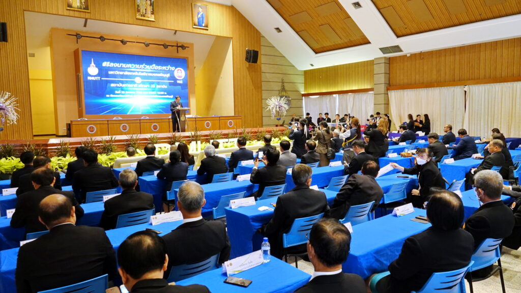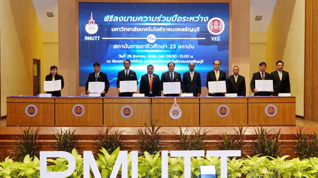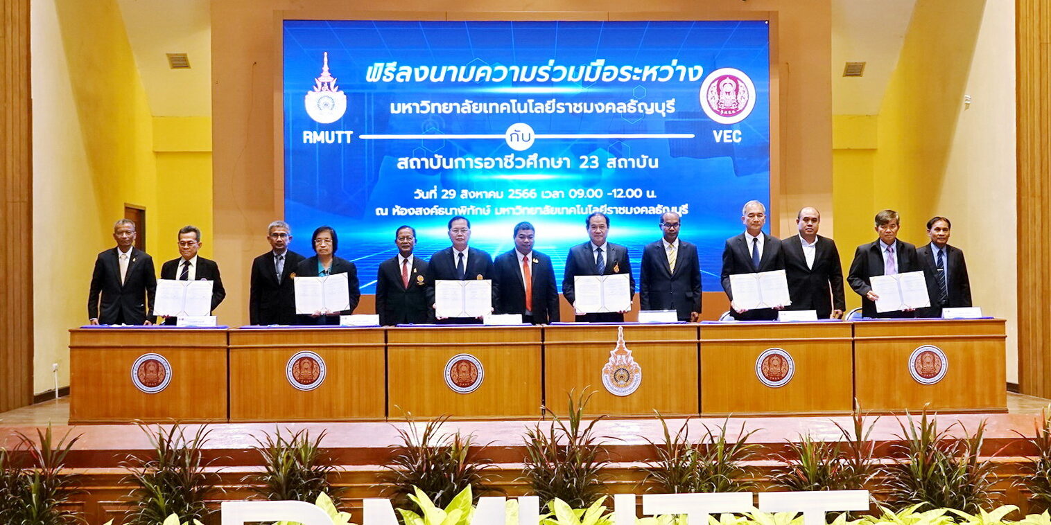 เมื่อเวลา 10.00 น. วันที่ 29 สิงหาคม 2566 ที่ห้องประชุมสงค์ธนาพิทักษ์ มทร.ธัญบุรี จ.ปทุมธานี รศ.ดร.สมหมาย ผิวสอาด อธิการบดี มทร.ธัญบุรี เป็นประธานในพิธีลงนามความร่วมมือทางวิชาการ เพื่อพัฒนากำลังคนด้านการศึกษา ยกระดับสมรรถนะวิชาชีพ พัฒนากลไกการรับเข้าศึกษาต่อ การฝึกประสบการณ์วิชาชีพ รวมถึงการวิจัยและบริการวิชาการ ระหว่าง มหาวิทยาลัยเทคโนโลยีราชมงคลธัญบุรี (มทร.ธัญบุรี) ร่วมกับ สำนักงานคณะกรรมการการอาชีวศึกษา (สอศ.) สถาบันการอาชีวศึกษา (สอ.) และสถาบันการอาชีวศึกษาเกษตร