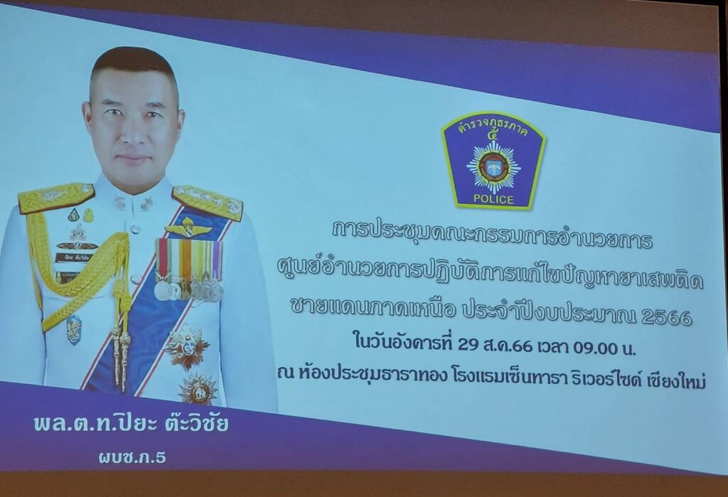 พล.ต.ท.ปิยะ ต๊ะวิชัย ผบช.ภ.5 เป็นผู้แทน ตร. เข้าร่วมประชุมคณะกรรมการอำนวยการศูนย์อำนวยการปฏิบัติการแก้ไขปัญหายาเสพติดชายแดนภาคเหนือ ประจำปีงบประมาณ 2566 (ศอ.ปส.ชน.) โดย มี พล.ท.สุริยะ เอี่ยมสุโร มท.ภ.3 เป็นประธานการประชุม ณ ห้องประชุมธาราทอง โรงแรมเซ็นทาราริเวอร์ไซค์ อ.เมืองเชียงใหม่