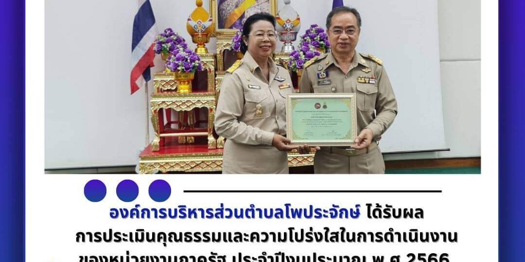 วันที่ 31 สิงหาคม 2566 นางน้ำทิพย์ โตสงัด นายกองค์การบริหารส่วนตำบลโพประจักษ์ได้เข้าร่วมรับมอบเกียรติบัตรจาก นายสุพจน์ ยศสิงห์คำ ผู้ว่าราชการจังหวัดสิงห์บุรี ร่วมกับ สำนักงาน ป.ป.ช. ประจำจังหวัดสิงห์บุรี มอบรางวัลการประเมินคุณธรรมและความโปร่งใสในการดำเนินงานของหน่วยงานภาครัฐ(Integrity and Transparency Assessment : ITA) ประจำปีงบประมาณ พ.ศ. 2566 ของหน่วยงานภาครัฐในจังหวัดสิงห์บุรี จำนวน 42 หน่วยงาน ณ ห้องประชุมขุนสรรค์ พันเรือง ชั้น 5 ศาลากลางจังหวัดสิงห์บุรี