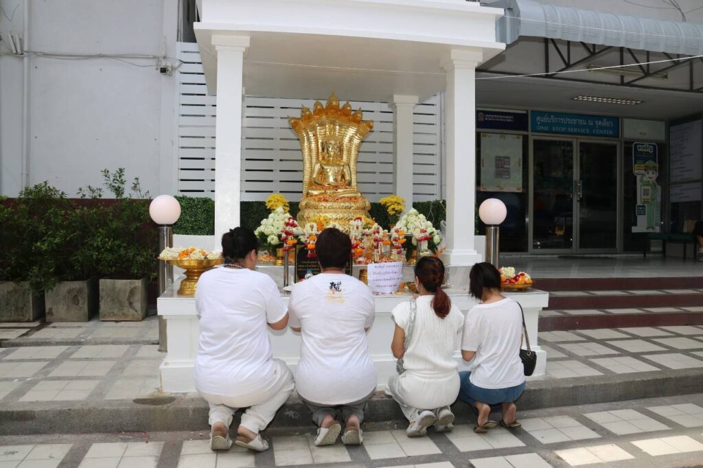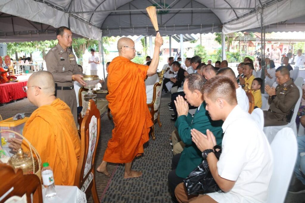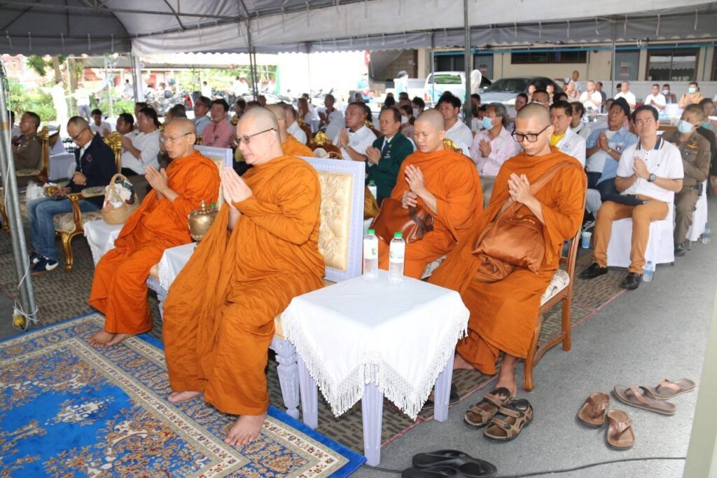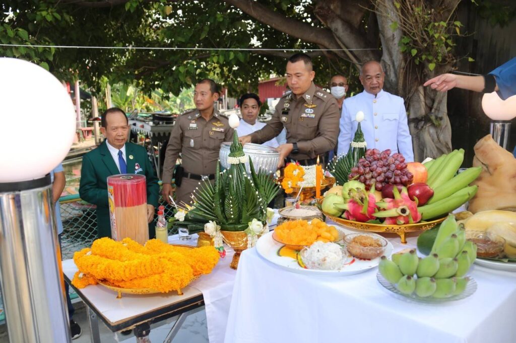 ต่อมา ช่วงเช้าของวันที่ 2 กันยายน 2566 ณ สน.บางเสาธง เขตภาษีเจริญ กรุงเทพมหานคร ได้มีพิธีบวงสรวงพระชัยมงคล (ศาลพระภูมิ) ต่อด้วยพิธีเบิกเนตรพระพุทธรูปหลวงพ่อเจ็ดกษัตริย์ พระสงฆ์จริญชัยมงคลคาถา พระสงฆ์เจริญพระพุทธมนต์ ประธานพร้อม คณะถวายจตุปัจจัยและไทยธรรม แด่พระสงฆ์ และกรวดน้ำ
