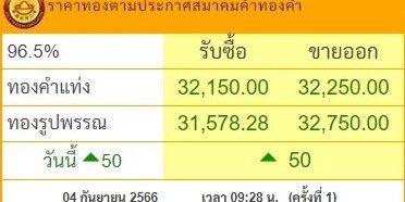 ราคาซื้อขายทองคําในประเทศชนิด 96.5% วันจันทร์ ที่ 4 กันยายน 2566 (ประกาศ ครั้งที่ 1)