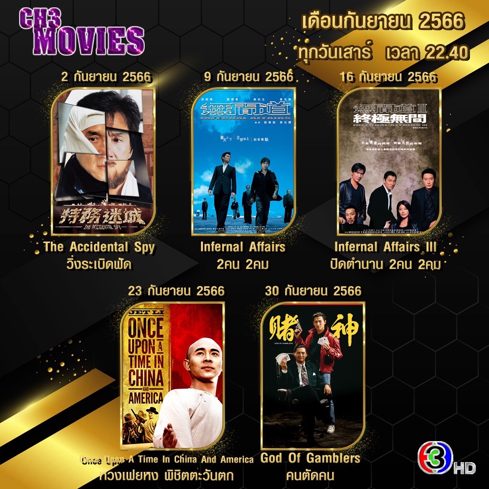 และเหมือนเช่นเคย ช่อง 3 ยังคงเอาใจคอหนังดังยามค่ำคืนโดยนำความสนุกจาก “แชนแนล ทรี มูฟวี่ส์” มาเสิร์ฟกันในเดือนกันยายนทุกคืนวันเสาร์ เวลา 22.40-00.40 น. เริ่มจาก วันเสาร์ที่ 2 กันยายน 2566 ภาพยนตร์เรื่อง The Accidental Spy (วิ่งระเบิดฟัด) นำแสดงโดย เฉินหลง, วิเวียนซู, คิมินจอง วันเสาร์ที่ 9 กันยายน 2566 ภาพยนตร์เรื่อง Infernal Affairs (2 คน 2 คม) นำแสดงโดย หลิวเต๋อหัว, เหลียงเฉาเหว่ย, หวงชิวเซิน วันเสาร์ที่ 16 กันยายน 2566 ภาพยนตร์เรื่อง Infernal Affairs III (ปิดตำนาน 2 คน 2 คม) นำแสดงโดย หลิวเต๋อหัว, เหลียงเฉาเหว่ย, หลี่หมิง วันเสาร์ที่ 23 กันยายน 2566 ภาพยนตร์เรื่อง Once Upon A Time In China And America (หวงเฟยหง พิชิตตะวันตก) นำแสดงโดย หลี่เหลียนเจี๋ย, กวนจือหลิน, สงซินซิน และ วันเสาร์ที่ 30 กันยายน 2566 ภาพยนตร์เรื่อง God Of Gamblers (คนตัดคน) นำแสดงโดย โจวเหวินฟะ, หลิวเต๋อหัว, หวังจู่เสียน