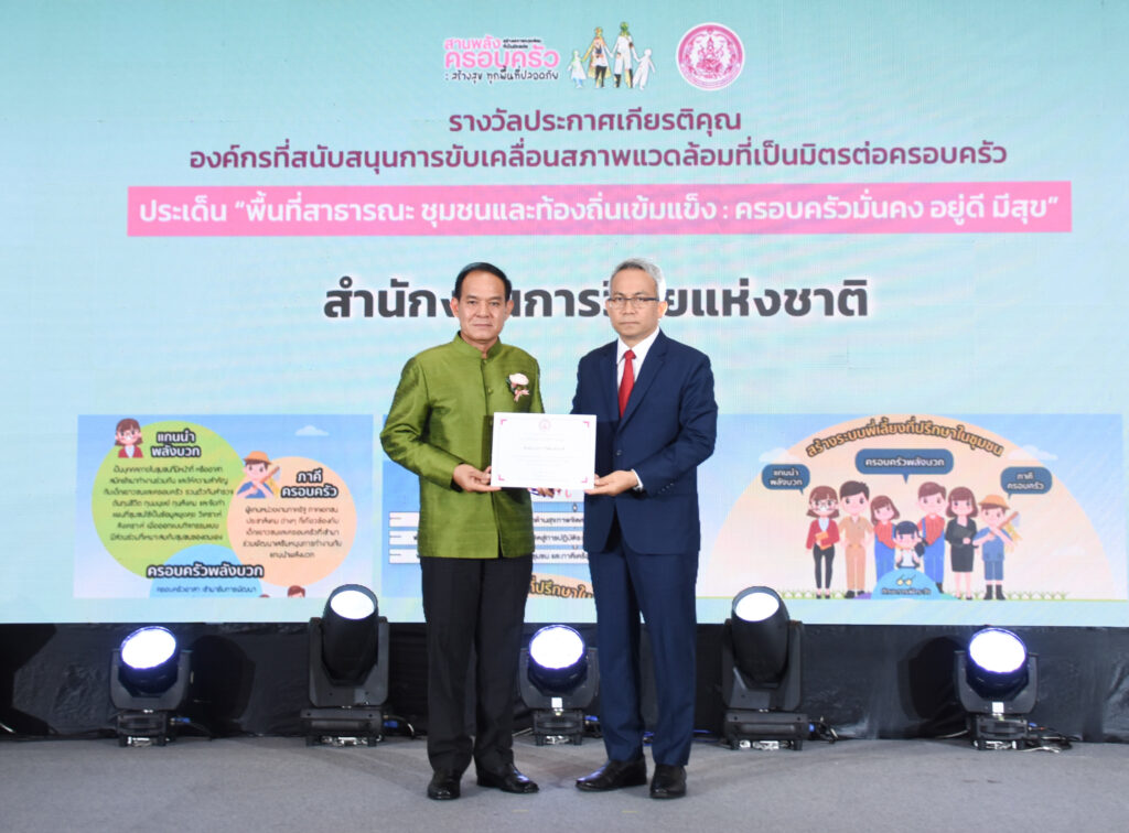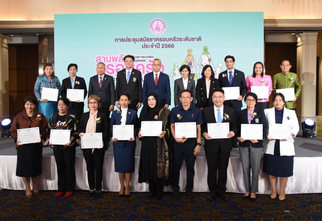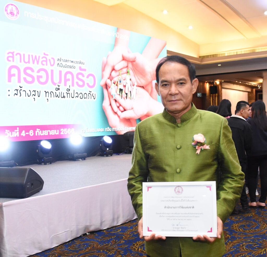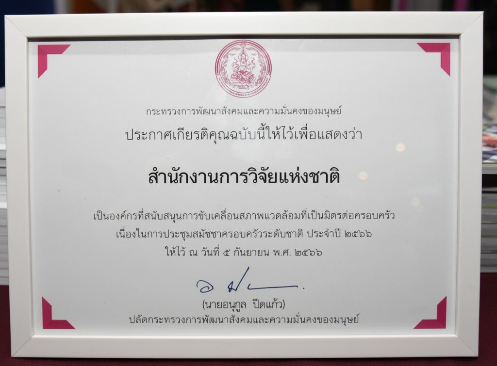 เมื่อวันที่ 5 กันยายน 2566 ดร.วิภารัตน์ ดีอ่อง ผู้อำนวยการสำนักงานการวิจัยแห่งชาติ (ผอ.วช.) มอบหมายให้ นายเอนก บำรุงกิจ รองผู้อำนวยการสำนักงานการวิจัยแห่งชาติ (รอง ผอ.วช.) เข้ารับรางวัลประกาศเกียรติคุณ “สำนักงานการวิจัยแห่งชาติ (วช.) เป็นองค์กรที่สนับสนุนการขับเคลื่อนสภาพแวดล้อมเป็นมิตรต่อครอบครัว” จากกระทรวงการพัฒนาสังคมและความมั่นคงของมนุษย์ (พม.) โดยมี นายอนุกูล ปีดแก้ว ปลัดกระทรวงการพัฒนาสังคมและความมั่นคงของมนุษย์ เป็นผู้มอบใบประกาศฯ ในการประชุมสมัชชาครอบครัวระดับชาติ ประจำปี 2566 ซึ่งจัดขึ้นเพื่อเปิดเวทีแลกเปลี่ยนเรียนรู้ แนวทางการดำเนินงานด้านครอบครัวอย่างสร้างสรรค์ และจัดทำสรุปข้อเสนอ เชิงนโยบายด้านครอบครัว ประจำปี 2566 จัดโดย กรมกิจการสตรีและสถาบันครอบครัว (สค.) ภายใต้กระทรวงการพัฒนาสังคมและความมั่นคงของมนุษย์ ระหว่างวันที่ 5–6 กันยายน 2566 ณ ห้องกษัตริย์ศึก โรงแรมเดอะทวิน ทาวเวอร์ กรุงเทพมหานคร