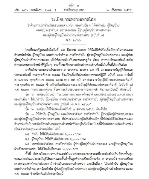 วันที่ 7 ก.ย.2566 ผู้สื่อข่าวรายงานว่า เว็บไซต์ ราชกิจจานุเบกษา เผยแพร่ ระเบียบกระทรวงมหาดไทย ว่าด้วยการเบิกจ่ายเงินตอบแทนตำแหน่ง และเงินอื่น ๆ ให้แก่กำนัน ผู้ใหญ่บ้าน แพทย์ประจำตำบล สารวัตรกำนัน ผู้ช่วยผู้ใหญ่บ้านฝ่ายปกครอง และผู้ช่วยผู้ใหญ่บ้านฝ่ายรักษาความสงบ (ฉบับที่ 7) พ.ศ. 2566 ลงนามโดย พล.อ.อนุพงษ์ เผ่าจินดา รัฐมนตรีว่าการกระทรวงมหาดไทย