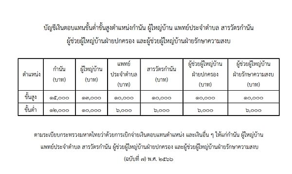 ประกาศฉบับดังกล่าวระบุว่า โดยที่คณะรัฐมนตรีเมื่อวันที่ 14 มี.ค.2566 ได้มีมติให้ปรับเพิ่มอัตราเงินตอบแทนตำแหน่งกำนัน ผู้ใหญ่บ้าน แพทย์ประจำตำบล สารวัตรกำนัน ผู้ช่วยผู้ใหญ่บ้านฝ่ายปกครอง และผู้ช่วยผู้ใหญ่บ้านฝ่ายรักษาความสงบ เพื่อให้สอดคล้องกับสภาพเศรษฐกิจ สังคม ค่าครองชีพและทัดเทียมกับค่าตอบแทนของเจ้าหน้าที่รัฐอื่น ๆ รวมทั้งสมาชิกสภาองค์กรปกครองส่วนท้องถิ่นในพื้นที่เดียวกันด้วย