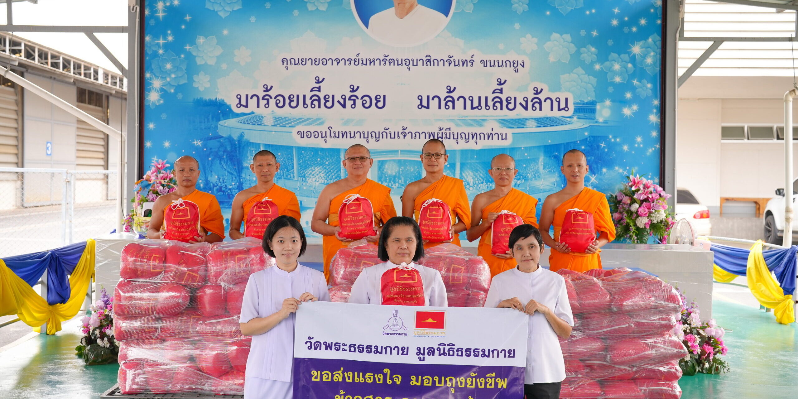 พระมหานพพร ปุญฺญชโย ป.ธ.9 รองผู้อำนวยการสำนักสื่อสารองค์กร วัดพระธรรมกาย กล่าวว่า จากความแปรปรวนของสภาพอากาศและปรากฏการณ์เอลนีโญทำให้เกิดฝนตกหนักและน้ำท่วมฉับพลันในจังหวัดต่าง ๆ ทำให้พี่น้องประชาชนได้รับความเดือนร้อน ทางกัลยาณมิตรจังหวัดจันทบุรี จึงแจ้งความจำนงค์เพื่อรับบริจาคถุงยังชีพ ข้าวสารอาหารแห้ง เพื่อบรรเทาความเดือดร้อนในพื้นที่ดังกล่าว ซึ่งวัดพระธรรมกาย มูลนิธิธรรมกาย และคณะศิษยานุศิษย์หลวงพ่อธัมมชโย จึงได้จัดชุดถุงยังชีพบรรจุข้าวสารอาหารแห้ง ซึ่งได้จากการบิณฑบาตในวันอาทิตย์ต้นเดือน และจากการบริจาคของกัลยาณมิตรทั่วโลก และขอแสดงความห่วงใย ส่งความปรารถนาดี ให้ทุกท่านมีกำลังกายกำลังใจที่เข้มแข็ง มีธรรมะของพระสัมมาสัมพุทธเจ้าเป็นที่พึ่ง ด้วยการสวดมนต์ ทำสมาธิให้จิตสงบ เพื่อลดความกังวล ความเครียด และขออวยพรให้ทุกท่านผ่านพ้นความยากลำบากครั้งนี้ไปให้ได้