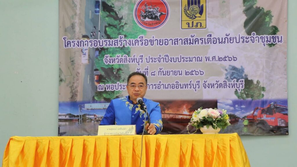 ปภ.สิงห์บุรี โดยมีนายสุพจน์ ยศสิงห์คำ ผู้ว่าราชการจังหวัดสิงห์บุรี เป็นประธานเปิดโครงการอบรมสร้างเครือข่ายอาสาสมัครเตือนภัยจำประชุมชนจังหวัดสิงห์บุรี ปี งบประมาณ 2566 ณ หอประชุมที่ว่าการอำเภออินทร์บุรี โดยนางสาวนงเยาว์ เทพศิริ หัวหน้าป้องกันและบรรเทาสาธารณภัยจังหวัดสิงห์บุรี ร่วมกับนางศิริลักษ์ เหมาะพิชัย นายอำเภออินทร์บุรี จัดอบรมฯผู้นำชุมชนและอสม.ตำบลชีน้ำร้าย อินทร์บุรี ประศุก และตำบลทับยา สร้างเครือข่ายรับมืออุทกภัยและสาธารณภัยทุกประเภท เพิ่มประสิทธิภาพของการปฏิบัติงานในการป้องกันและลดผลกระทบการเตรียมความพร้อมการเผชิญเหตุ และการช่วยเหลือ โดยมุ่งเน้นการมีส่วนร่วมของประชาชนที่อยู่ในหมู่บ้าน ชุมชน เป็นการสร้างโอกาสให้ประชาชนพัฒนาชุมชนให้มีความพร้อมป้องกันตนเอง รู้วิธีการลดผลกระทบและรู้กระบวนการแจ้งเตือนภัยเสริมสร้างชุมชนให้มีความเข้มแข็งเพื่อการป้องกันและลดกระทบของภัยที่เกิดขึ้นในพื้นที่โดยคัดเลือกพื้นที่เสี่ยงอุทกภัยที่มีที่ตั้งอยู่ริมแม่น้ำหรือมีประวัติการเกิดอุทกภัยซ้ำซากเป็นการสร้างเครือข่ายอาสาสมัครเตือนภัยในชุมชน เพื่อเฝ้าระวังเหตุการณ์ภัยพิบัติ ตรวจสอบสถานการณ์การรายงานเหตุการณ์การเปลี่ยนแปลงของธรรมชาติรวมทั้งการกระจายข่าวการแจ้งเตือนภัยพิบัติให้กับชุมชนรวมกลุ่มพัฒนาและเรียนรู้ร่วมกันเพื่อสร้างศักยภาพแก่ตนเองและสร้างความเข้มแข็งให้แก่ชุมชนในการป้องกันภัยพิบัติที่อาจเกิดขึ้นต่อไป