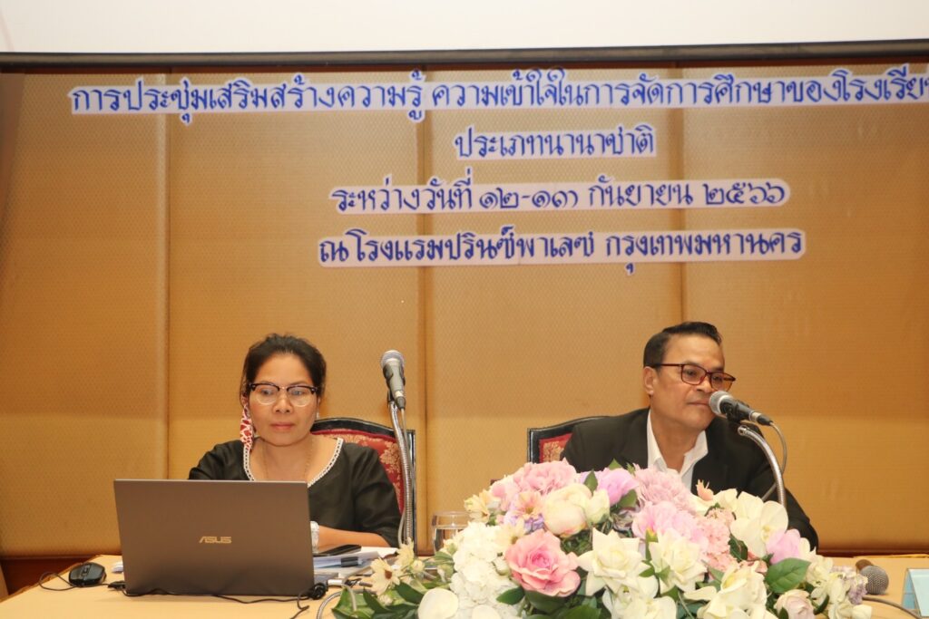 สำหรับการประชุมเสริมสร้างความรู้ ความเข้าใจการจัดการศึกษาของโรงเรียนในระบบ ประเภทนานาชาติ ประจำปีงบประมาณ พ.ศ.2566 ในครั้งนี้ จัดขึ้นตั้งแต่วันที่ 12-13 กันยายน 2566 ได้รับความอนุเคราะห์วิทยากรซึ่งเป็นผู้ทรงคุณวุฒิผู้มีความรู้ความสามารถและประสบการณ์ จากกรมการกงสุล กรมการจัดหางาน สำนักงานตรวจคนเข้าเมือง สำนักงานรับรองมาตรฐานและประเมินคุณภาพการศึกษา (องค์การมหาชน) ผู้อำนวยการโรงเรียนสาธิตพัฒนา ชมรม Thai Teachers’ meet และ บริษัท เอพี ซอฟแวร์ มีผู้เข้าร่วมประชุมประกอบด้วย ผู้บริหารโรงเรียนและครูโรงเรียนในระบบ ประเภทนานาชาติ จำนวน 245 โรงเรียน