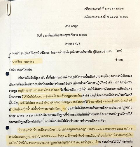 เมื่อวันที่ 12 กันยายน 2566 ที่ผ่านมา เพจเฟซบุ๊ก ‘พลตำรวจเอกเสรีพิศุทธ์ เตมียเวส’ ได้เผยแพร่เอกสารคำพิพากษา โดยระบุข้อความว่า ‘วันนี้ศาลมีคำพิพากษาจำคุก นายสิระ เจนจาคะ 8 เดือน โดยไม่รอลงอาญา‘