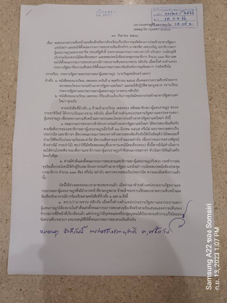 โดย นายวัชระ กล่าวว่า วันนี้ส่งหนังสือถึงประธานสภาฯ ขอสอบถามความคืบหน้าข้อเท็จจริงการร้องเรียนการทุจริตก่อสร้างอาคารรัฐสภาแห่งใหม่ และการตั้งคณะกรรมการสอบสวนข้อเท็จจริง นางพรพิศ เพชรเจริญ เลขาธิการสภาผู้แทนราษฎร และนายสาธิต ประเสริฐศักดิ์ รองเลขาธิการสภาผู้แทนราษฎร ในฐานะประธานคณะกรรมการตรวจการจ้างโครงการก่อสร้างอาคารรัฐสภาแห่งใหม่ กับพวก กรณีอนุมัติเบิกเงินงวดงานไม้ตะเคียนทอง และการลดสเปคการสร้างผนังห้องประชุมคณะกรรมาธิการ (กมธ.) 213 ห้อง ว่าเป็นข้อเท็จจริงหรือไม่ โดยปรากฎว่าส่อว่ามีการทุจริต ซึ่งตนเคยยื่นเรื่องต่อนายชวน หลีกภัย อดีตประธานสภาฯ ซึ่งได้มอบหมายให้ข้าราชการที่เกี่ยวข้องดำเนินการตามขั้นตอน และนายชวน ได้ลงนามเห็นชอบลงนามตั้งคณะกรรมการสอบสวนฯ นางพรพิศ และนายสาธิต เมื่อเดือน พ.ย. 65 แต่ปรากฎว่ามีข้าราชการลบลายเซ็นของนายชวน และมีการแก้ไขหนังสือดังกล่าว ทำให้ไม่มีการตั้งคณะกรรมการสอบสวนฯ จริงหรือไม่