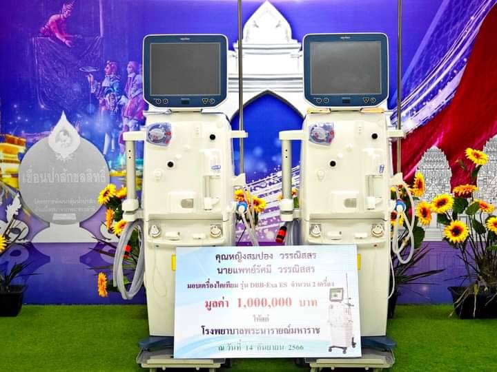 เครื่องไตเทียม รุ่น DBB-EXA ES จำนวน 2 เครื่อง มูลค่า 1,000,000 บาท (หนึ่งล้านบาทถ้วน) เพื่อเป็นการสนับสนุนการปฏิบัติงานของบุคลากรทางการแพทย์