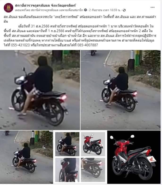 วันนี้ 14 ก.ย.2566 สภ.ลับแล ร่วมกับ สภ.ด่านแม่คำมัน ได้ร่วมกันจับกุมคนร้ายวิ่งราวทรัพย์สร้อยคอทองคำได้แล้ว สืบเนื่องจากเมื่อวันที่ 31 ส.ค.2566 และวันที่ 1 ก.ย.2566 ได้มีคนร้ายวิ่งราวทรัพย์ และทาง สภ.ลับแล ได้แจ้งเตือนภัยให้ประชาชนในพื้นที่ควรระวังคนร้ายวิ่งราวทรัพย์และให้ช่วยกันติดตามคนร้าย ชุดสืบสวน สภ.ลับแล และ สภ.ด่านแม่คำมัน ได้เร่งกันติดตามคนร้ายตลอดมา และวันนี้จับได้แล้ว จึงนำผู้ต้องหาส่งตัวดำเนินคดีตามกฎหมายต่อไป