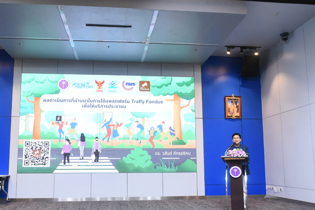 ศาสตราจารย์ชูกิจ ลิมปิจำนงค์ ผู้อำนวยการสำนักงานพัฒนาวิทยาศาสตร์และเทคโนโลยีแห่งชาติ (สวทช.) กล่าวว่า (สวทช.) โดยหน่วยบริการนวัตกรรมดิจิทัลสำหรับเมือง (สวทช.) ได้พัฒนาแพลตฟอร์ม ‘ทราฟฟี่ ฟองดูว์’ ซึ่งเป็นการนำเทคโนโลยีดิจิทัลมาประยุกต์ใช้เพื่อเพิ่มประสิทธิภาพระบบรับแจ้งและบริหารจัดการปัญหาเมือง และใช้เป็นเครื่องมือสำคัญในการช่วยรับเรื่องร้องเรียนปัญหาเมือง โดยมีการขยายผลการใช้งานไปทั่วประเทศ ปัจจุบันระบบฯ ได้รับแจ้งเรื่องแล้วมากกว่า 373,000 เรื่อง มีหน่วยงานรับแจ้งในระบบรวมมากกว่า 10,400 หน่วยงาน ซึ่งประกอบด้วย เทศบาล มากกว่า 1,300 หน่วยงาน และองค์การบริหารส่วนตำบล มากกว่า 1,800 หน่วยงาน ครอบคลุมการใช้งานทั่วประเทศ โดยมี 14 จังหวัด ที่เข้าร่วมใช้งานแล้วทุกหน่วยราชการ ได้แก่ กรุงเทพมหานคร,นครราชสีมา,อุบลราชธานี,ขอนแก่น,พะเยา,ลำพูน,ปราจีนบุรี,ภูเก็ต,เพชรบูรณ์,สมุทรปราการ,สระบุรี,เชียงใหม่,ลำปาง และสิงห์บุรี และอยู่ระหว่างประสานงานเพื่อเข้าร่วมใช้งานทุกหน่วยราชการ อีก 3 จังหวัด ได้แก่ ตรัง นนทบุรี และแม่ฮ่องสอน