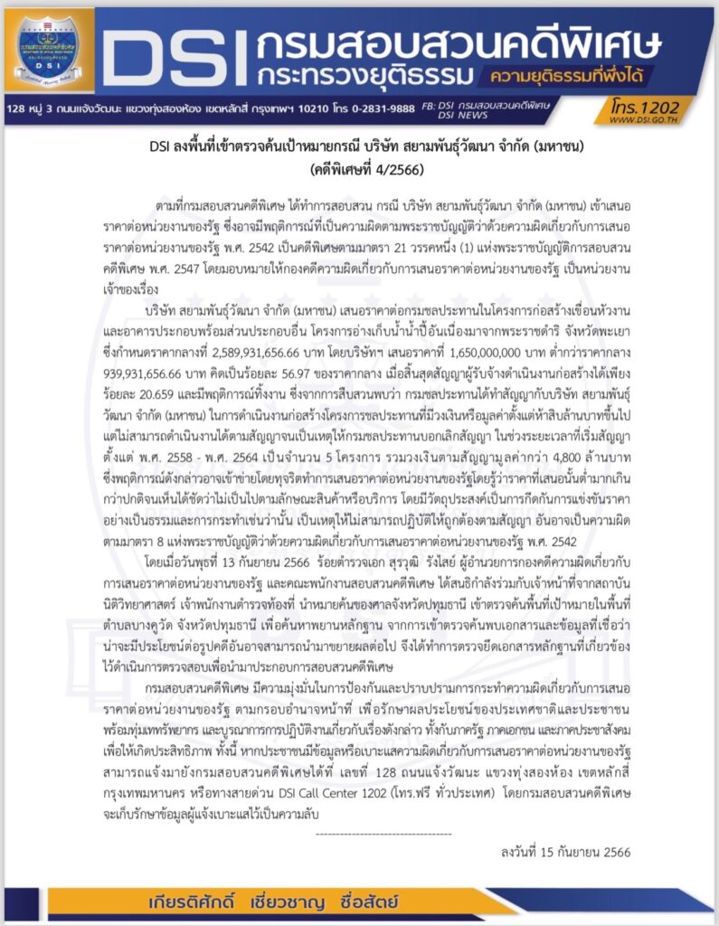 โดยเมื่อวันพุธที่ 13 กันยายน 2566 ร้อยตำรวจเอก สุรวุฒิ รังไสย์ ผู้อำนวยการกองคดีความผิดเกี่ยวกับการเสนอราคาต่อหน่วยงานของรัฐ และคณะพนักงานสอบสวนคดีพิเศษ ได้สนธิกำลังร่วมกับเจ้าหน้าที่จากสถาบันนิติวิทยาศาสตร์ เจ้าพนักงานตำรวจท้องที่ นำหมายค้นของศาลจังหวัดปทุมธานี เข้าตรวจค้นพื้นที่เป้าหมายในพื้นที่ตำบลบางคูวัด จังหวัดปทุมธานี เพื่อค้นหาพยานหลักฐาน จากการเข้าตรวจค้นพบเอกสารและข้อมูลที่เชื่อว่าน่าจะมีประโยชน์ต่อรูปคดีอันอาจสามารถนำมาขยายผลต่อไป จึงได้ทำการตรวจยึดเอกสารหลักฐานที่เกี่ยวข้องไว้ดำเนินการตรวจสอบเพื่อนำมาประกอบการสอบสวนคดีพิเศษ