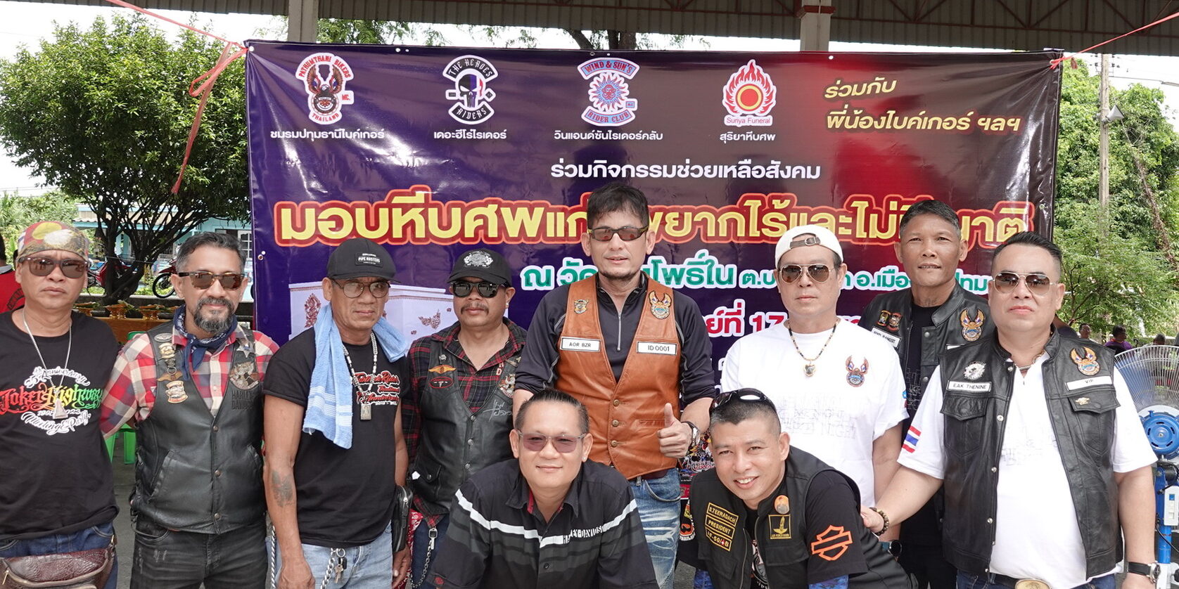 วันที่ 17 กันยายน 2566 ที่วัดบางโพธิ์ใน ตำบลบางปรอก อำเภอเมืองปทุมธานี จังหวัดปทุมธานี นายธนาเดช ประตูแก้ว (พี่อ้อ คอเพลง) ประธานชมรมปทุมธานีไบค์เกอร์ เดอะฮีโร่โรเดอร์ วินแอนด์ซันไรเดอร์คลับ ร่วมกับสุริยาหีบศพ และพี่น้องกลุ่มไบค์เกอร์คนรักการขับขี่ฮาร์เล่ย์ ร่วมกิจกรรมช่วยเหลือสังคม มอบหีบศพแก่ศพยากไร้และไม่มีญาติ