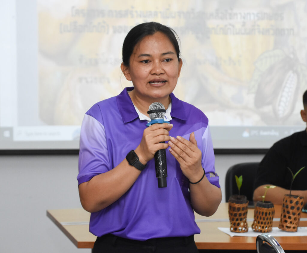 นางสวาท ไพศาลศิริทรัพย์ หัวหน้าโครงการวิจัย กล่าวว่า จากการดำเนินการงานของ โครงการ การสร้างมูลค่าเพิ่มจากวัสดุเหลือใช้ทางการเกษตร (เปลือกโกโก้) ของเครือข่ายเกษตรกรผู้ปลูกโกโก้ในพื้นที่จังหวัดตาก นั้น ทีมนักวิจัยได้ศึกษาบริบทพื้นที่ เกษตรกรในพื้นที่ อำเภอพบพระ จังหวัดตาก พบว่าชาวบ้านในพื้นที่กลุ่มเกษตรกรปลูกโกโก้เป็นจำนวนมาก เมื่อผลผลิตมากขึ้น จึงนำมาสู่จุดสำคัญที่กลุ่มเกษตรกรผู้ปลูกโกโก้และกลุ่มวิสาหกิจชุมชนออร์แกนิค ได้ร่วมกับทางคณาจารย์จากวิทยาลัยชุมชนตาก ในการพัฒนานวัตกรรม และแนวทางการแปรรูป การพัฒนาช่องทางการตลาด เพื่อแก้ไขปัญหา เพื่อสร้างทางเลือกในการสร้างรายได้ให้กับเกษตรกร โดยผสมผสานกระบวนการงานวิจัยเพื่อท้องถิ่น (Community Based Research) มุ่งพัฒนาทางเลือกหรือวิธีการใหม่ๆ ในการยกระดับเศรษฐกิจในชุมชน ด้านการนำวัสดุเหลือใช้ทางการเกษตรกลับมาใช้ประโยชน์ โดยมุ่งเน้นการสร้างการมีส่วนร่วมทั้งบุคลากรจากหน่วยงานภาครัฐ ภาคเอกชน ซึ่งจากการศึกษาพบว่าการปลูกโกโก้สายพันธุ์ M1 มีพื้นที่การปลูกกระจายอยู่หลายแห่ง ปลูกมากที่อำเภอพบพระ และนิยมปลูกเป็นพืชแซมกับพืชเศรษฐกิจอื่น ปัจจุบันในพื้นที่ยังไม่มีการนำเปลือกโกโก้มาใช้ประโยชน์ และขยะถูกทิ้งเป็นขยะมีปริมาณสูงขึ้น จึงได้คิดค้นวิธีการที่จะรับมือกับปัญหาเปลือกโกโก้วัสดุเหลือใช้ทางการเกษตรจะทำอย่างไรให้มูลค่าเพิ่มขึ้นมา โดยนำเปลือกโกโก้มาแปรรูปได้ 3 รูปแบบ ดังนี้