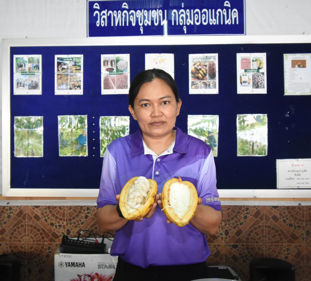 จากผลการพัฒนาถ่ายทอดรูปแบบการแปรรูปผลิตภัณฑ์จากเปลือกโกโก้ ไปสู่การใช้ชีวิตแบบ Zero Waste คือการหมุนเวียนทรัพยากรกลับมาใช้ใหม่ให้เกิดประโยชน์สูงสุด สมาชิกวิสาหกิจชุมชนออร์แกนิกร่วมทำการวิจัยและทดลองนำเปลือกโกโก้มาแปรรูปเป็นผลิตภัณฑ์อาหารสัตว์ ช่วยลดต้นทุนการเลี้ยงโค เมื่อเทียบอาหารสัตว์สำเร็จรูปในท้องตลาดและเมื่อเทียบอัตราการเจริญเติบโตกับโคพื้นเมืองเพศผู้ อายุ 2–3 ปี น้ำหนักประมาณ 300 กิโลกรัม จำนวน 5 ตัว แสดงให้เห็นว่าคุณภาพอาหารที่ใช้ต่อโคทั้ง 2 กลุ่ม มีคุณภาพที่ใกล้เคียงกัน ทำให้เกษตรกรจะมีรายได้เพิ่มขึ้น และลดรายจ่ายในครอบครัวเรือน ไปสู่การสร้างระบบเศรษฐกิจ หมุนเวียนที่เน้นการแปลงของเหลือใช้ทางการเกษตรหรือของเสียให้เป็นแหล่งรายได้ในอนาคตได้อย่างยั่งยืน