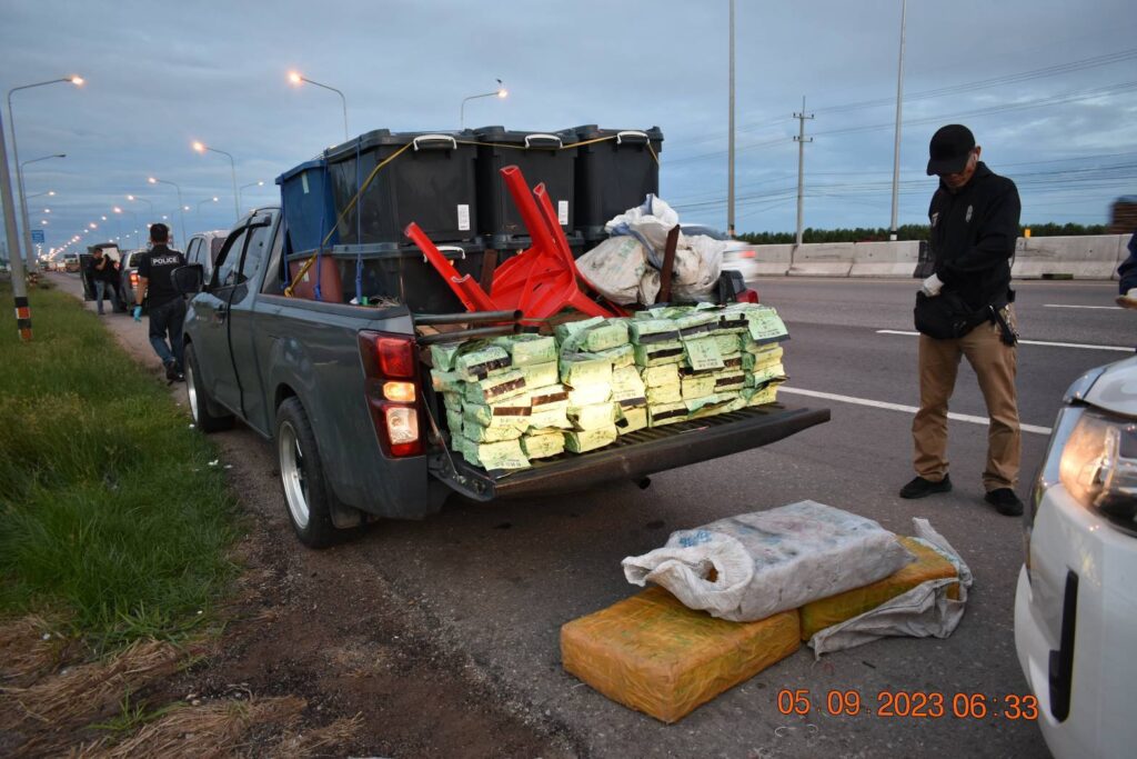 รายที่ 2 เป็นการประสานความร่วมมือกัน ระหว่าง ตำรวจ บก.สกัดกั้นการลำเลียงยาเสพติด (บก.สกส.) และ ตำรวจ ปส.4 ซึ่งสืบสวนทราบว่า นายเฉลิม ซึ่งเป็นขบวนการค้ายาเสพติด ที่ตำรวจ ปส. กำลังติดตามตัว จะลักลอบลำเลียงยาเสพติด จาก จ.พระนครศรีอยุธยา ไปส่งให้ขบวนการค้ายาเสพติดในพื้นที่ จ.สงขลา และ จ.สตูล จึงเฝ้าติดตามจับกุม จนกระทั่งวันที่ 8 ก.ย.66 เวลาประมาณ 10.50 น. ได้พบรถกระบะ ยี่ห้อ ISUZU สีขาว ทะเบียน บห 13xx พระนครศรีอยุธยา และรถเก๋งยี่ห้อฮอนด้า สีเทา ทะเบียน 4กธ 49xxกรุงเทพมหานคร ขับขี่ไปบนเส้นถนนเพชรเกษม จ.ชุมพร ซึ่งตรงกับข้อมูลที่ได้รับ จึงไล่ติดตามจับกุม ผลการตรวจค้นพบยาเสพติดไอซ์ 245 กก. อยู่ในรถกระบะ ISUZU สีขาว ทะเบียน บห 13xx พระนครศรีอยุธยา มีนายเฉลิม เป็นผู้ขับขี่ และ รถเก๋งฮอนด้า สีเทา ทะเบียน 4กธ 49xx กรุงเทพมหานคร มีนายจักรกฤษณ์ เป็นผู้ขับขี่ โดยมี น.ส.สุชานันท์ และ น.ส.นภัสวรรณ นั่งไปด้วย ซึ่งรับว่าทำหน้าที่เป็นรถสำรวจเส้นทางในการลำเลียงยาเสพติด ตำรวจ ปส.จึงจับกุมผู้ต้องหาพร้อมของกลาง นำส่งพนักงานสอบสวน ปส.4 ดำเนินคดี และสืบสวนขยายผลถึงผู้ร่วมขบวนการต่อไป