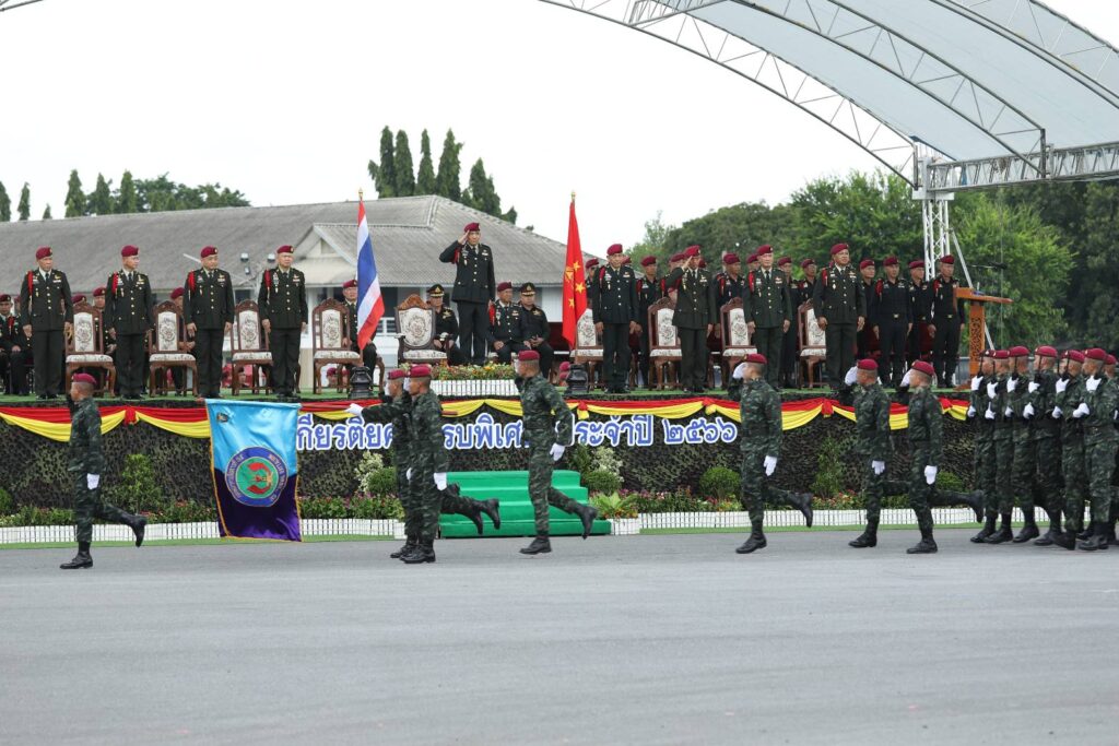 ซึ่ง หน่วยบัญชาการสงครามพิเศษ ได้จัดกำลังพล จาก 3 กองพันทหารรบพิเศษ จำนวนกว่า 400 นาย กระทำพิธีวิ่งสวนสนาม เพื่อเชิดชูเกียรติ แก่นายทหารชั้นสัญญาบัตร และนายทหารชั้นประทวน ตลอดจนลูกจ้าง ในสังกัดหน่วยขึ้นตรง ของหน่วยบัญชาการสงครามพิเศษ ที่จะครบกำหนดเกษียณอายุราชการ และผู้ที่ขอลาออกจากราชการ ก่อนกำหนด ประจำปี 2566 จำนวนทั้งสิ้น 133 คน ซึ่งในจำนวนนี้ เป็นนายทหารชั้นยศนายพล จำนวน 10 นาย อาทิ พล.อ.ภูมิพัฒน์ จันทร์สว่าง ประธานคณะที่ปรึกษาพิเศษกองทัพบก พล.อ.ชนาวุธ บุตรกินรี หัวหน้าคณะนายทหารฝ่ายเสนาธิการประจำผู้บังคับบัญชา พล.อ.ฐกัด หลอดศิริ หัวหน้าสำนักงานที่ปรึกษากองทัพบก และ พล.ต.ปิยะมิตร พลเยี่ยม รองหัวหน้าสำนักงานประธานคณะที่ปรึกษากองทัพบก รวมอยู่ด้วย
