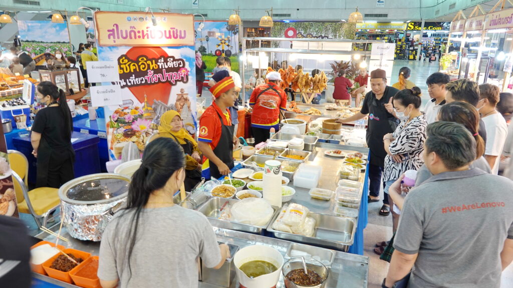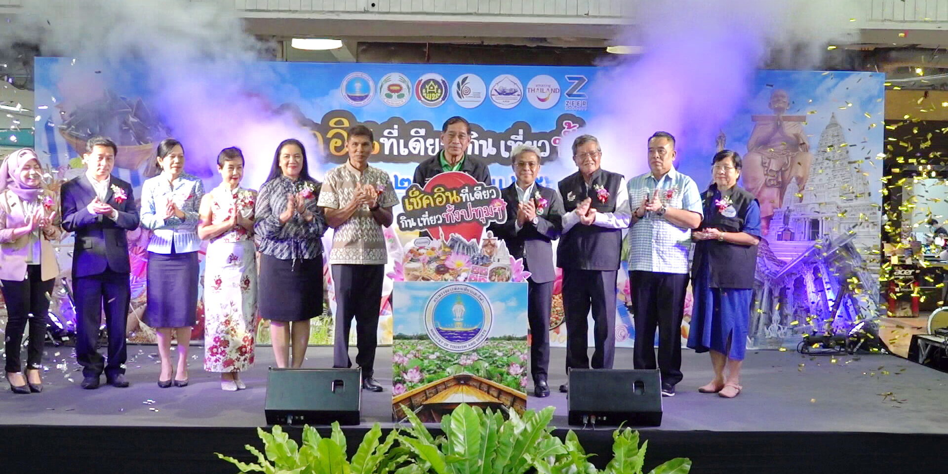 บรรยากาศพิธีเปิดมี นายสุทัศน์ คงแย้ม ท่องเที่ยวและกีฬาจังหวัดปทุมธานี , นายชาญยุทธ เศวตสุวรรณ ผู้อำนวยการ ททท.สำนักงานกรุงเทพมหานคร , นายปกรณ์พัฒน์ เทพเอื้อตระกูล รองประธานสภาอุตสาหกรรมท่องเที่ยวจังหวัดปทุมธานี , นายพงศธรรศ รุจิพุฒธันยพัต นายกสมาคมนักข่าวจังหวัดปทุมธานี หัวหน้าส่วนราชการ และประชาชนที่สนใจเข้าร่วมงาน ภายในงานนำอาหารชวนชิม ทั้งอาหารดั้งเดิมของชนชาติไทย อาหารพื้นบ้าน มอญ อิสลาม อาหารพื้นบ้าน ของหวานและผลิตภัณฑ์สินค้า OTOP ที่ขึ้นชื่อของจังหวัดปทุมธานี อาทิ ข้าวแช่มอญเมืองปทุมธานี ก๋วยเตี๋ยวเรือรสเด็ด ข้าวยำสมุนไพร วุ้นดอกบัว เมี่ยงคำดอกบัว ข้าวเกรียบมอญโบราณ ทอดมันหน่อกะลา ข้าวเกรียบกองถ่าย ปลาดุกแดดเดียว ขนมเบื้อง รวมกว่า 30 ร้าน มาจำหน่ายแก่นักท่องเที่ยวและประชาชนผู้สนใจได้เลือกช็อป ชิมตามใจชอบในที่เดียว รวมทั้งเป็นการช่วยเหลือผู้ประกอบการรายย่อยในจังหวัดปทุมธานีอย่างเป็นรูปธรรม สร้างการกระจายรายได้ลงไปสู่ระดับท้องถิ่น
