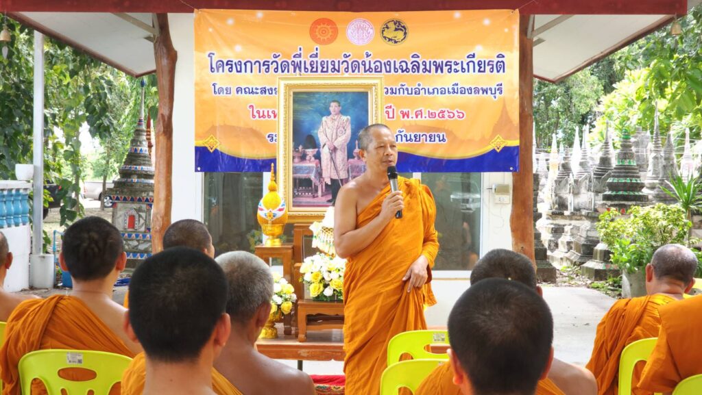 ทั้งนี้ โครงการ “วัดพี่เยี่ยมวัดน้อง” ถือเป็นโครงการซึ่งใช้หลักธรรมทางพระพุทธศาสนา สุขา สังฆัสสะ สามัคคี ความพร้อมเพียงของหมู่สงฆ์ในการนำความสุขมาให้ ในรูปแบบ “วัด ประชา รัฐ สร้างสุข” ด้วยการทำกิจกรรมจิตอาสา ทั้งพระทั้งโยม ช่วยกันทำความสะอาด เก็บกวาด ล้างห้องน้ำ ตัดหญ้า ตัดแต่งกิ่งไม้ และปรับแต่งภูมิทัศน์ในพื้นที่บริเวณวัด โดยพิจารณาจากวัดในเขตปกครองของคณะสงฆ์อำเภอเมืองลพบุรี ที่มีพระภิกษุที่จำพรรษาอยู่น้อย โดยเฉพาะในช่วงเทศกาลเข้าพรรษา เพื่อแสดงถึงความพร้อมเพียงของหมู่สงฆ์ ในการนำความสุขมาให้ ตามโครงการ “วัดพี่เยี่ยมวัดน้อง” ซึ่งจะหมุนเวียนโครงการไปตามวัดต่างๆ อย่างน้อยสัปดาห์ละ 2 วัด เพื่อเป็นแบบอย่างให้แก่พุทธศาสนิกชน ทั่วไป ในการทำความดี ด้วยการร่วมด้วยช่วยกันช่วยเหลือพระสงฆ์ ในดูแลความสะอาดวัด ในพื้นที่ชุมชนของตนเอง โดยเฉพาะวัดที่มีพระภิกษุสงฆ์จำพรรษาอยู่น้อย