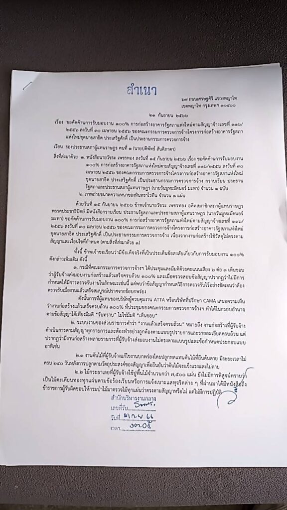 เมื่อวันที่ 21 ก.ย. นายวัชระ เพชรทอง อดีตสส.บัญชีรายชื่อ พรรคประชาธิปัตย์ แถลงว่า ตนทำหนังสือถึงนายปดิพัทธ์ สันติภาดา รองประธานสภาผู้แทนราษฎร คนที่1 ขอคัดค้านการรับมอบงาน 100% การก่อสร้างอาคารรัฐสภาแห่งใหม่ ด้วยเพราะพบกระบวนการของคณะกรรมการตรวจการจ้างโครงการก่อสร้างอาคารรัฐสภาแห่งใหม่ของสำนักงานเลขาธิการสภาผู้แทนราษฎรผิดข้อสัญญาที่กำหนดให้การตรวจรับงานเมื่องานแล้วเสร็จสมบูรณ์ปราศจากข้อบกพร่อง แต่ที่ผ่านมาคณะกรรมการตรวจการจ้างฯ กลับใช้วิธีมีมติด้วยคะแนนเสียง 6 ต่อ 1 เห็นชอบว่าผู้รับจ้างส่งมอบงานก่อสร้างแล้วเสร็จครบถ้วน 100%