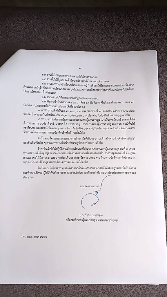 “นอกจากนี้ยังพบว่ามีงานก่อสร้างหลายรายการที่ผู้รับจ้างส่งมอบงานไม่ตรงตามแบบรูปและข้อกำหนดประกอบแบบ อาทิเช่น งานต้นไม้ งานพื้นไม้ งานถมทรายหลังเขื่อนบริเวณสนามหญ้าริมเขื่อน เป็นต้น รวมถึงค่าปรับงานล่าช้าวันละ12.2 ล้านบาท นับถึงวันนี้ 20 ก.ย. 2566 จำนวน 994 วัน คิดเป็นจำนวนเงินค่าปรับทั้งสิ้น 12.2 หมื่นล้านบาท ได้เรียกค่าปรับกับผู้รับจ้างตามสัญญาหรือไม่” นายวัชระ กล่าว