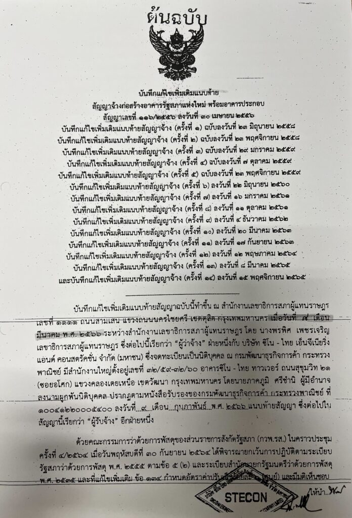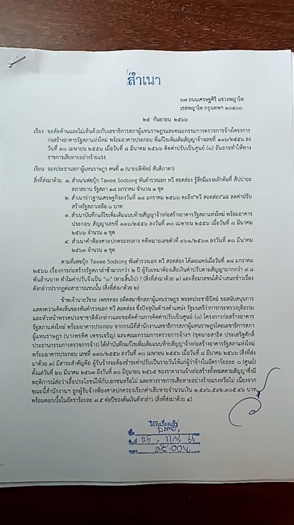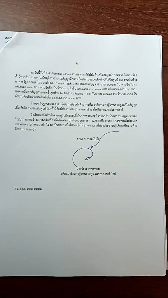เมื่อวันที่ 26 ก.ย. นายวัชระ เพชรทอง อดีต สส.พรรคประชาธิปัตย์ เปิดเผยว่า ตนได้ส่งหนังสือถึงนายวันมูหะมัดนอร์ มะทา ประธานรัฐสภาและประธานสภาผู้แทนราษฎร และนายปดิพัทธ์ สันติภาดา รองประธานสภาผู้แทนราษฎร คนที่หนึ่ง เมื่อวันที่ 25 ก.ย.ที่ผ่านมา เพื่อคัดค้านและไม่เห็นด้วยกับนายพรพิศ เพชรเจริญ เลขาธิการสภาผู้แทนราษฎร และคณะกรรมการตรวจการจ้างโครงการก่อสร้างอาคารรัฐสภาแห่งใหม่ พร้อมอาคารประกอบ ที่แก้ไขเพิ่มเติมสัญญาจ้างเลขที่ 116/2556 ลงวันที่ 30 เม.ย. 56 เมื่อวันที่ 8 มี.ค. 66 โดยคิดค่าปรับก่อสร้างล่าช้าเป็นศูนย์ (0) ตั้งแต่วันที่ 26 มี.ค. 63 ถึงวันที่ 30 มิ.ย. 65 ของราคางานจ้างก่อสร้างทั้งหมดตามสัญญา ซึ่งมีพฤติการณ์ส่อว่าเอื้อประโยชน์ให้กับเอกชนหรือไม่ และทางราชการเสียหายอย่างร้ายแรงหรือไม่