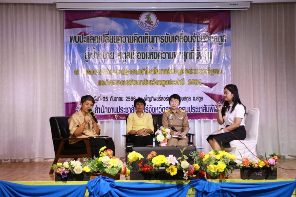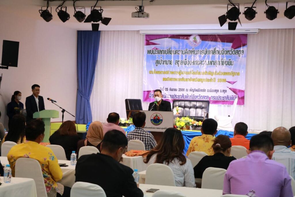 ที่เพ็ญทิพย์รีสอร์ท อำเภอเมืองสตูล จังหวัดสตูล สำนักงานประชาสัมพันธ์จังหวัดสตูล จัดกิจกรรม “พบปะแลกเปลี่ยนความคิดเห็นการขับเคลื่อนจังหวัดสตูล สู่เป้าหมายสตูลเมืองแห่งความผาสุกที่ยั่งยืน” โดยมีนายชาตรี ณ ถลาง รองผู้ว่าราชการจังหวัดสตูล รักษาราชการแทนผู้ว่าราชการจังหวัดสตูล เป็นประธานในพิธีเปิด พร้อมด้วยนายจรัส บำรุงเสนา ประชาสัมพันธ์จังหวัดสตูล ตลอดจนหัวหน้าส่วนราชการ สื่อมวลชนจังหวัดสตูล ผู้สื่อข่าวโทรทัศน์ฯ ผู้สื่อข่าววิทยุ ผู้สื่อข่าวหนังสือพิมพ์ส่วนกลาง และท้องถิ่น ผู้ดำเนินรายการวิทยุกระจายเสียง และแอดมินเพจ เครือข่ายประชาสัมพันธ์ เข้าร่วมกิจกรรมกว่า 70 คน