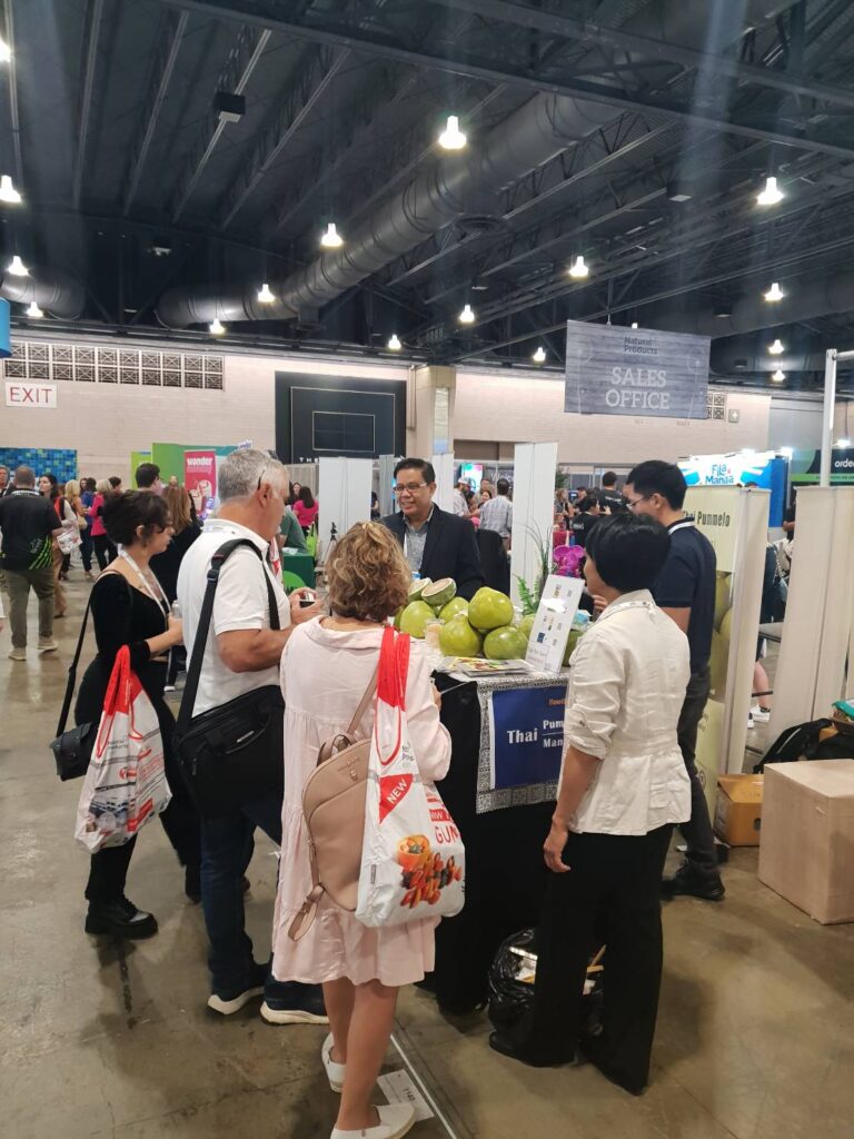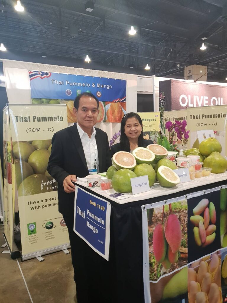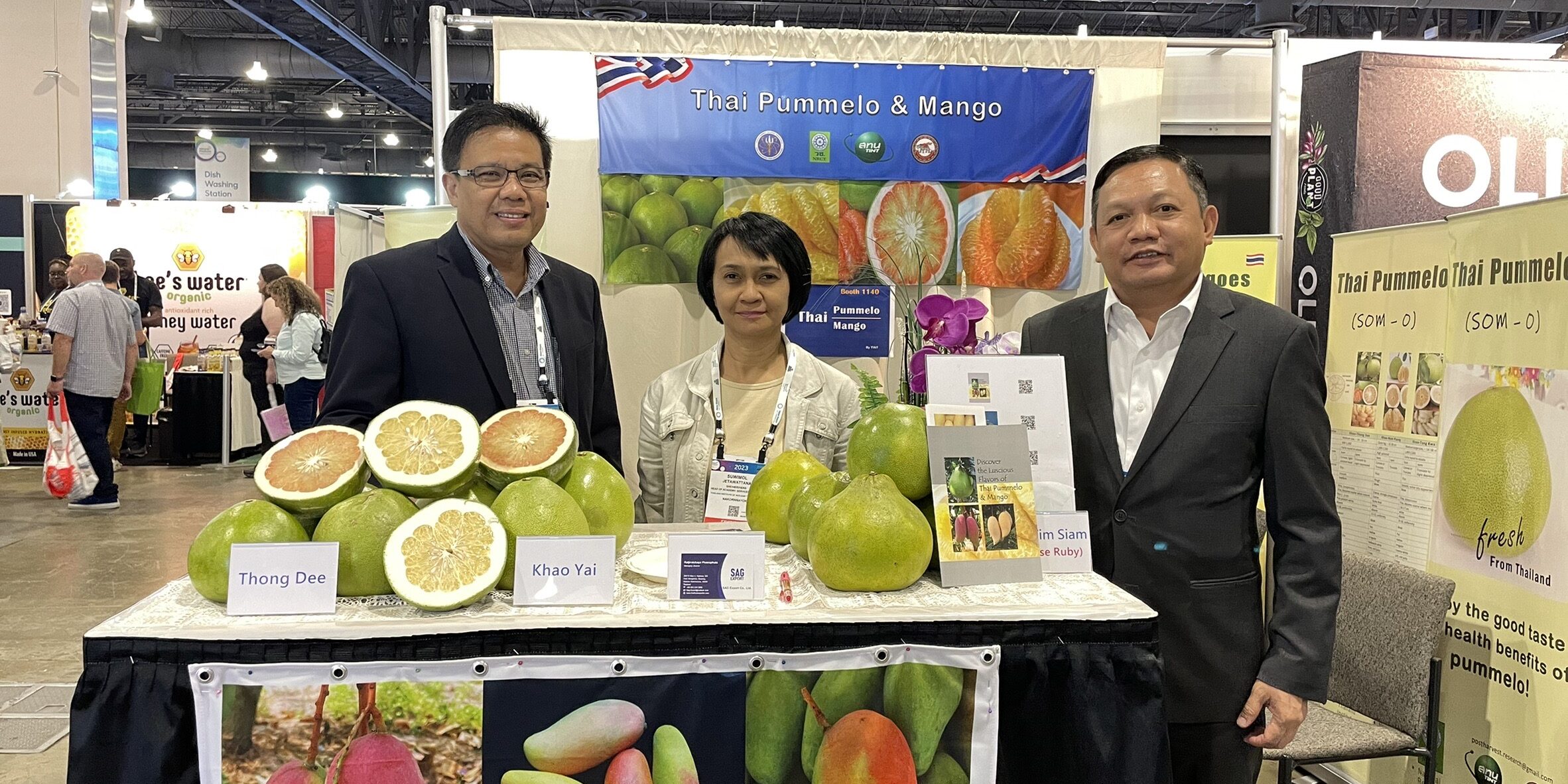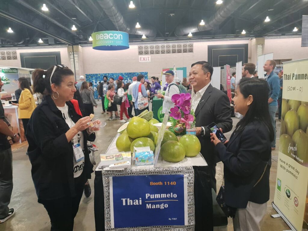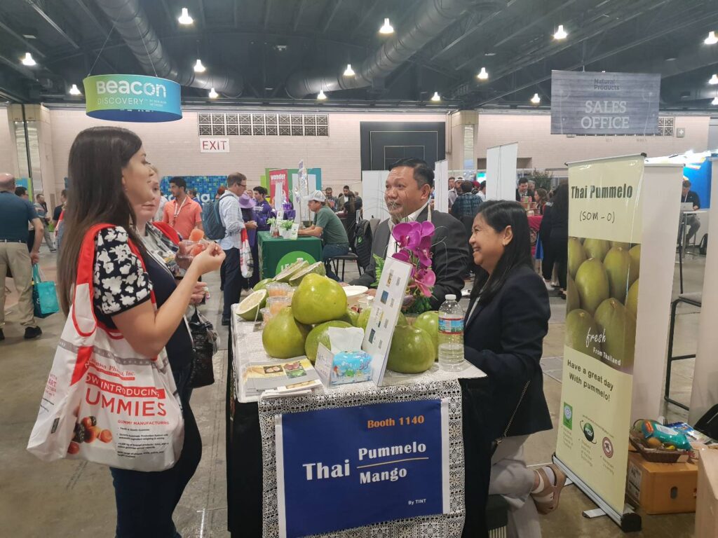สำหรับงาน Natural Products Expo East นั้น เป็นงานที่จัดขึ้นเป็นประจำทุกปีในช่วงฤดูใบไม้ร่วง (Fall) ของประเทศสหรัฐอเมริกา เป็นงานแสดงเกี่ยวกับอุตสาหกรรมผลิตภัณฑ์จากธรรมชาติ ผลิตภัณฑ์เกษตรอินทรีย์ ผัก ผลไม้ ผลิตภัณฑ์เพื่อสุขภาพ และผลิตภัณฑ์อาหารเสริมต่างๆ จัดขึ้น ณ เมืองฟิลาเดลเฟีย รัฐเพนซิลเวเนีย ประเทศสหรัฐอเมริกา ในระหว่างวันที่ 20-23 กันยายน พ.ศ.2566 มีผู้แสดงสินค้ากว่า 1,500 ราย จากหลายประเทศทั่วโลก มีผู้เข้าร่วมแสดงผลงาน (ผู้เชี่ยวชาญด้านอุตสาหกรรม) กว่า 29,000 ราย เป็นงานแสดงสินค้าที่มีศักยภาพสูงและคาดว่าจะมีผู้เข้าร่วมงานเพื่อเจรจาธุรกิจจากทั้งในสหรัฐอเมริกาและประเทศต่างๆ ทั่วโลก ไม่ต่ำกว่า 50,000 คน โดย (วช.) และทีมวิจัยจึงนำส้มโอจำนวน 4 สายพันธุ์ ได้แก่ ทองดี ขาวแตงกวา ขาวใหญ่ และทับทิมสยาม ไปออกบูธเพื่อเปิดตัว นำเสนอ และแนะนำส้มโอไทยให้ผู้บริโภคได้รู้จัก ได้ทดลองชิมรสชาติ พบว่า ผู้บริโภคให้การยอมรับและชื่นชอบรสชาติและสีสันของส้มโอไทยเป็นอย่างมาก นอกจากนี้ยังได้พบและเจรจาการค้ากับภาคเอกชนในหลายประเทศ เป็นการสร้างเครือข่ายกับผู้ขายในอุตสาหกรรมเดียวกัน ทำให้สามารถเปิดตลาดสหรัฐฯ ได้เพิ่มมากขึ้น