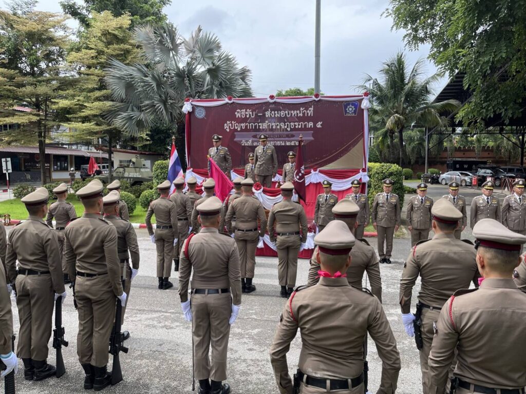พล.ต.ท.ปิยะ ต๊ะวิชัย ผบช.ภ.5 ,พล.ต.ต.กฤตธาพล ยี่สาคร รอง ผบช.ภ.5 ,พล.ต.ต.พฤทธิพงษ์ ประยูรศิริ รอง ผบช.ภ.5 ,พล.ต.ต.นพดล กรึงไกร รอง ผบช.ภ.5 พร้อม ผบก.ฯ หน.สภ.ในสังกัด ภ.5 เข้าร่วมพิธีรับ-ส่ง หน้าที่ผู้บัญชาการตำรวจภูธรภาค 5 ณ ลานหน้าอาคาร ภ.5
