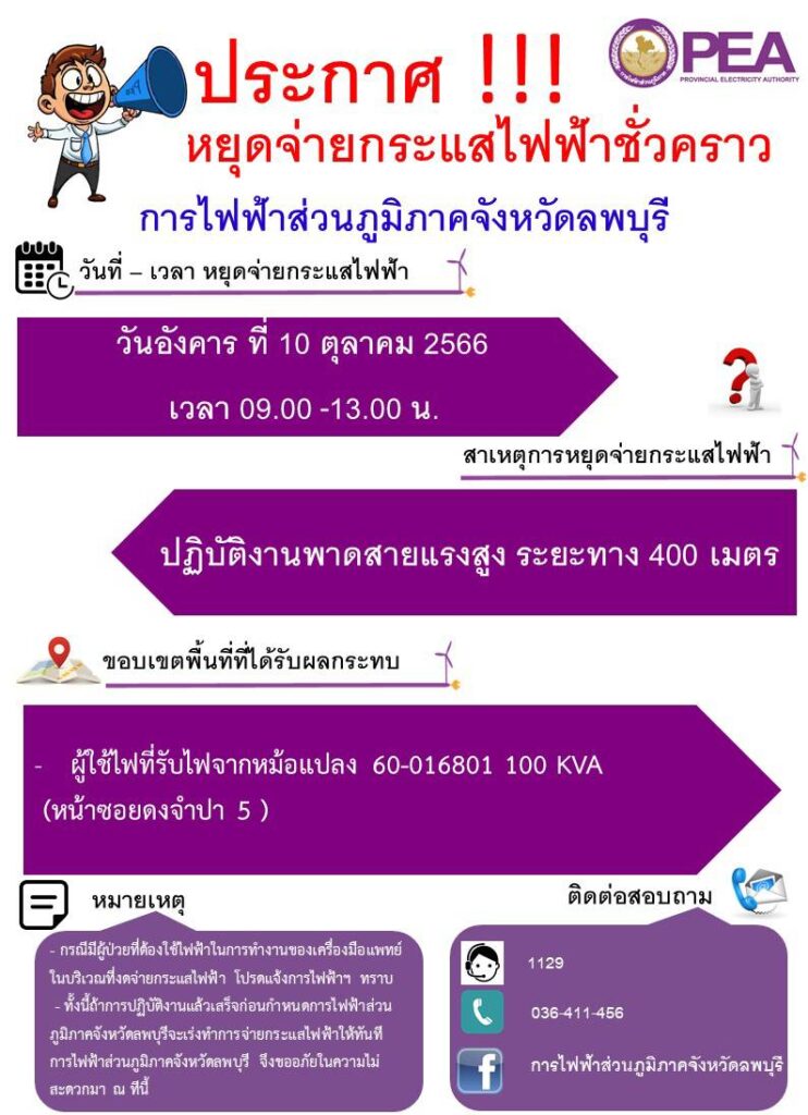 จึงขออภัยในความไม่สะดวกมา ณ ที่นี้ หากดำเนินการแล้วเสร็จก่อนเวลาจะเร่งรัการไฟฟ้าส่วนภูมิภาค จังหวัดลพบุรี