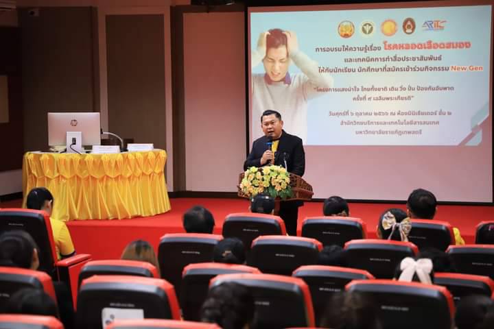 วันที่ 6 ตุลาคม 2566 ที่อาคารสำนักวิทยบริการและเทคโนโลยีสารสนเทศ ชั้น 2 มหาวิทยาลัยราชภัฏเทพสตรี นายปรัชญา เปปะตัง รองผู้ว่าราชการจังหวัดลพบุรี เป็นประธานเปิดการอบรมให้ความรู้ เรื่อง โรคหลอดเลือดสมองและเทคนิคการทำสื่อประชาสัมพันธ์ให้กับนักเรียน นักศึกษาที่สมัครเข้าร่วมกิจกรรม New Gen ใน “โครงการแสงนำใจ ไทยทั้งชาติ เดิน วิ่ง ปั่ น ป้องกันอัมพาต ครั้งที่ 9 เฉลิมพระเกียรติ ” โดยมี นางเขมกร นิ่มดิษฐ์ ผู้อำนวยการกลุ่มบริหารงานบุคคล รักษาการแทนศึกษาธิการจังหวัดลพบุรีผศ.ดร.กันตพัฒน์ กิตติอัชวาลย์ รองอธิการบดีมหาวิทยาลัยราชภัฎเทพสตรี ทีมแพทย์และพยาบาลจากโรงพยาบาลนารายณ์มหาราช อาจารย์ นักเรียน นักศึกษา เข้าร่วมอบรม