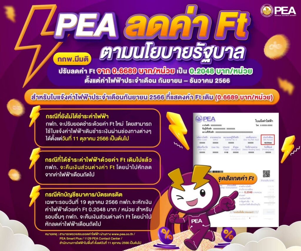 PEA ลดค่า Ft ตามนโยบายรัฐบาล เพื่อลดภาระค่าใช้จ่ายด้านไฟฟ้าให้แก่ประชาชน