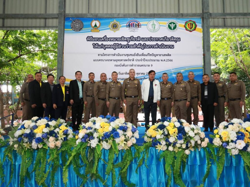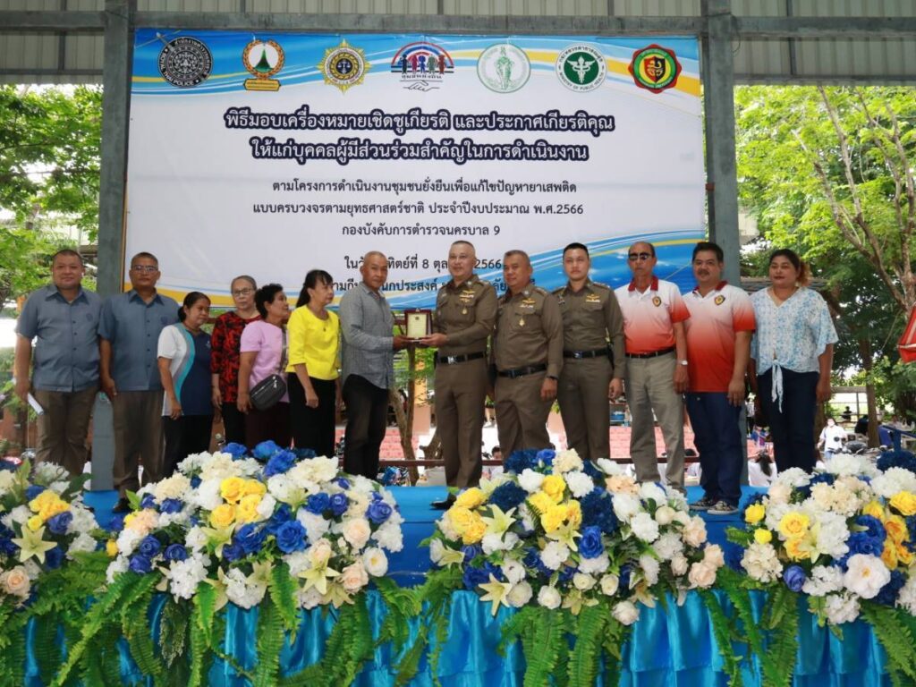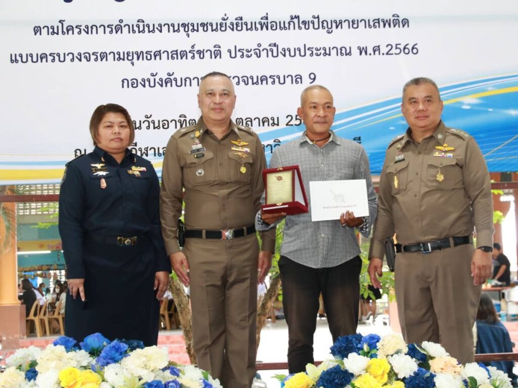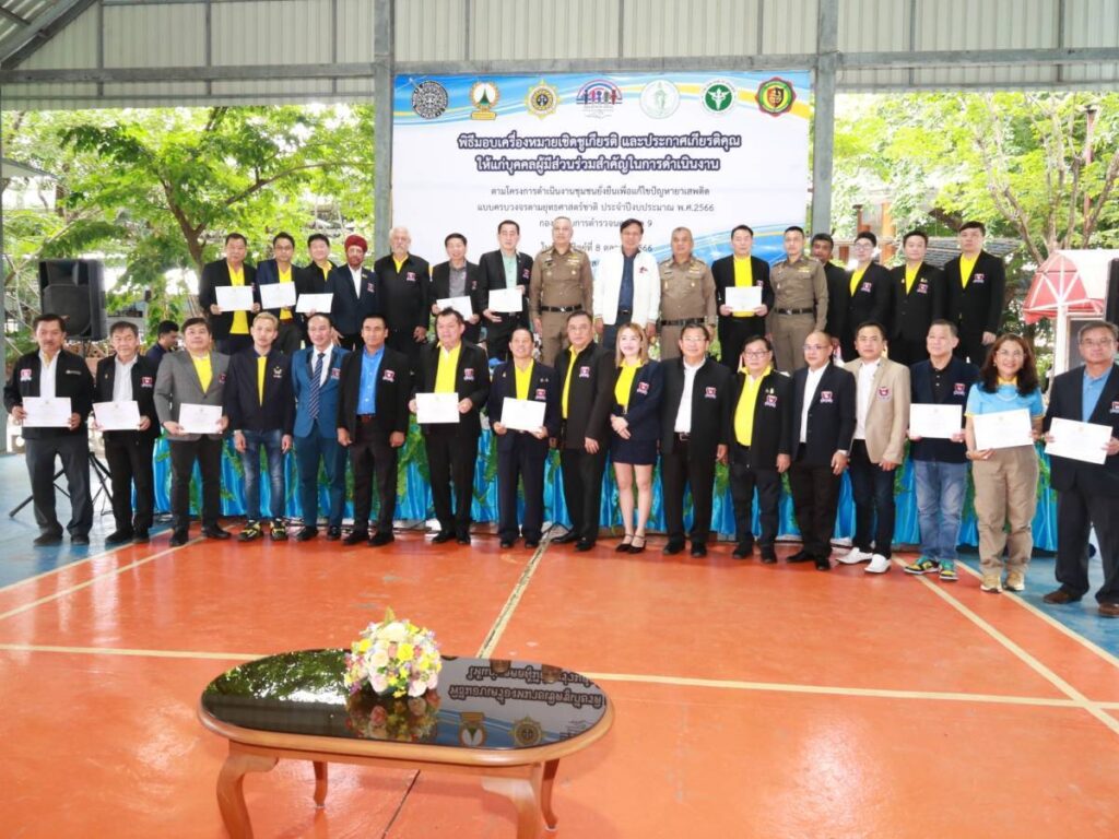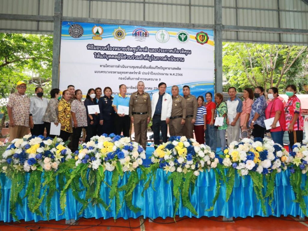 รอง ผบก. พ.ต.อ. ธีระชัย เด็ดขาด รอง ผบก. พ.ต.อ. ศภุวัช ปานแดง รอง ผบก.สำนักงานปปส.เจ้าหน้าที่ปกครอง เจ้าหน้าที่ สาธารณสุข สำนักงานเขต .ร่วมในพิธีมอบเข็มเชิดชูเกียรติ และประ.ใบประกาศเกียรติคุณ แก่ผู้ร่วมในการสนับสนุนในโครงการชุชนยั่งยืนเพื่อแก้ไขปัญหายาเสพติด เปลี่ยนผู้เสพให้เป็นผู้ป่วยดูแลรักษาให้มีอาชีพที่มั่นคง มีเกยรติ มีศัดิ์กศรี ส่งคืนสู่อ้อมกอดของพ่อแม่