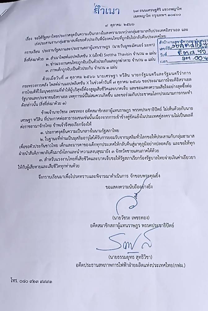 วันนี้ 9 ตุลาคม 2566 เวลา 13.30 น. ที่ห้องแถลงข่าวรัฐสภานายวัชระ เพชรทอง อดีตสมาชิกสภาผู้แทนราษฎร พรรคประชาธิปัตย์ และนายธรรมยุทธ สุทธิวิชา อดีตประธานสหภาพการไฟฟ้าฝ่ายผลิตแห่งประเทศไทย (กฟผ.) ได้ส่งหนังสือถึงนายวันมูหะมัดนอร์ มะทา ประธานรัฐสภาและประธานสภาผู้แทนราษฎร เพื่อขอให้รัฐสภาไทยประกาศจุดยืนความเป็นกลางในสงครามระหว่างกลุ่มฮามาสกับประเทศอิสราเอล และเร่งประสานงานกลุ่มฮามาสเพื่อขอตัวประกันพี่น้องคนไทยที่ถูกจับไปกลับคืนประเทศไทย