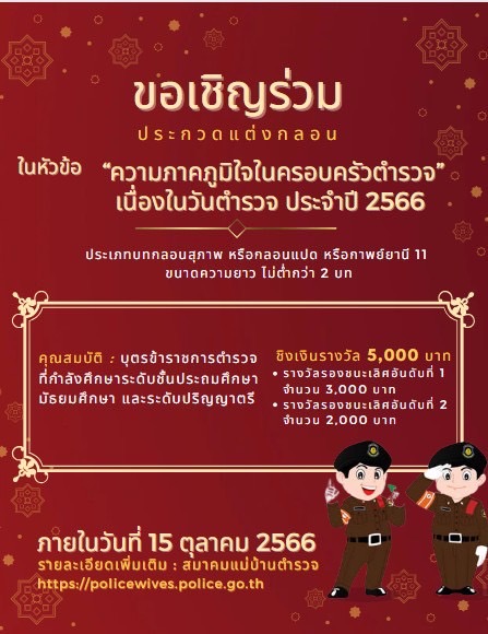 นายกสมาคมแม่บ้านตำรวจ กล่าวว่า โอกาสนี้ ขอเชิญบุตรหลานข้าราชการตำรวจร่วมส่งผลงานการแต่งกลอน “ความภาคภูมิใจในครอบครัวตำรวจ” โดยมีรางวัลการประกวด หน่วยงานละ 3 รางวัล ประกอบด้วย รางวัลชนะเลิศ จำนวน 5,000 บาท โดยรางวัลชนะเลิศของแต่ละกองบัญชาการ หรือเทียบเท่า และกองบังคับการในสังกัดสำนักงานผู้บัญชาการตำรวจแห่งชาติ จะนำไปเผยแพร่ในแอปพลิเคชันแทนใจ,รางวัลรองชนะเลิศ อันดับ 1 จำนวน 3,000 บาท,รางวัลรองชนะเลิศ อันดับ 2 จำนวน 2,000 บาท โดยส่งผลงานได้ส่งผลงานทาง e-mail : policewives2566@gmail.com ภายในวันที่ 15 ต.ค.2566 ดูรายละเอียดเพิ่มเติมได้ทางเว็บไซต์สมาคมแม่บ้านตำรวจ https://policewives.police.go.th