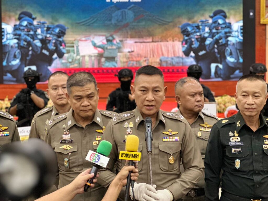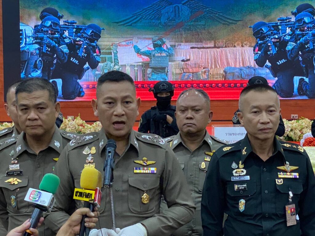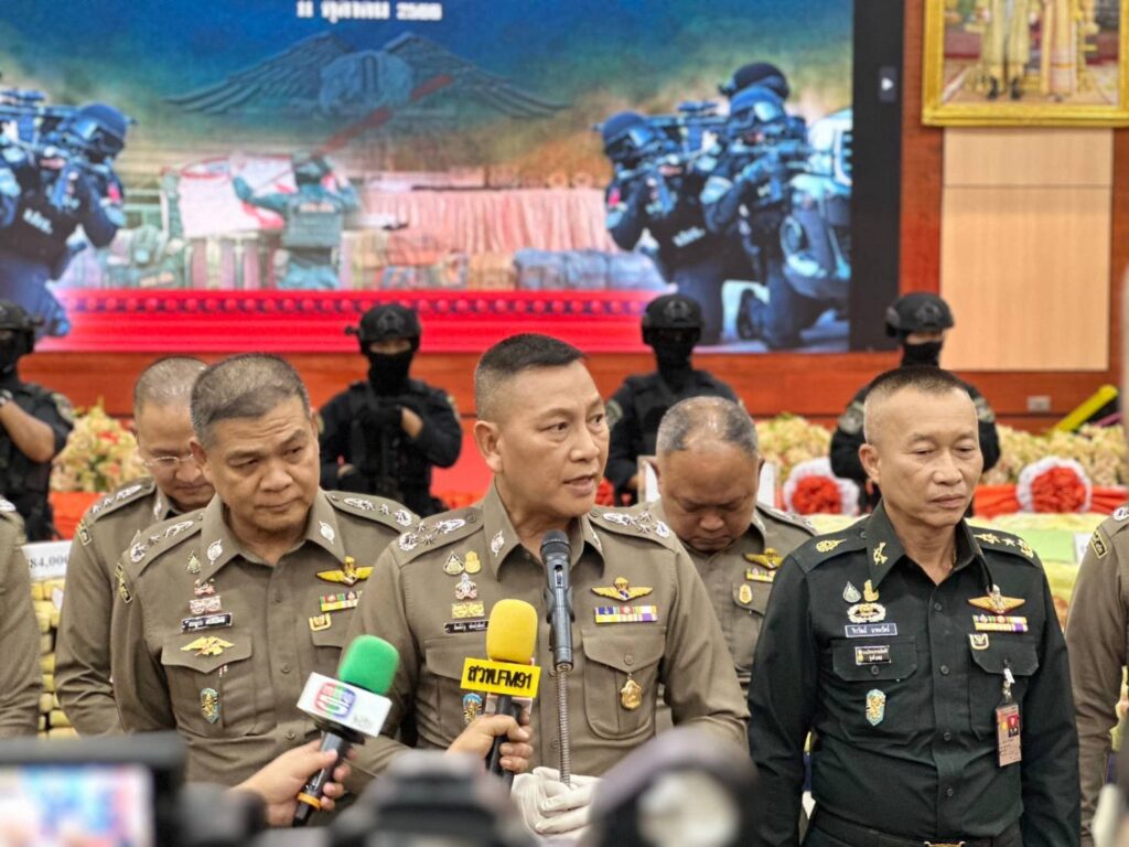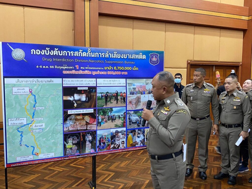 เมื่อวันที่ 11 ต.ค.2566 เวลา 13.30 น. พล.ต.อ.กิตติ์รัฐ พันธุ์เพ็ชร์ รอง ผบ.ตร. เดินทางมาเป็นประธานการแถลงผลการจับกุมเครือข่ายยาเสพติดรายใหญ่ ตามนโยบายการแก้ปัญหายาเสพติดของรัฐบาล และนโยบายของ พล.ต.อ.ต่อศักดิ์ สุขวิมล ผบ.ตร. ที่มุ่งเน้นการแก้ไขปัญหายาเสพติดในทุกมิติ ทั้งการปราบปรามผู้ผลิตและผู้ค้ายาเสพติด โดยใช้มาตรการทางกฎหมายอย่างจริงจังและเด็ดขาด รวมถึงการเพิ่มประสิทธิภาพในการสกัดกั้นการลำเลียงยาเสพติดตามแนวชายแดน หรือใช้ประเทศไทยเป็นเส้นทางผ่าน และใช้มาตรการยึดทรัพย์เพื่อตัดวรจรการค้ายาเสพติด