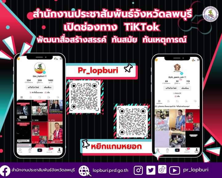 ประชาสัมพันธ์จังหวัดลพบุรี กล่าวต่อไปว่า สำนักงานประชาสัมพันธ์จังหวัดลพบุรี ได้เล็งเห็นถึงการพัฒนา ที่รวดเร็ว ทันสมัย และตอบโจทย์ได้ทุกกลุ่มเป้าหมาย จึงได้เปิดช่องทาง แพลตฟอร์ม TikTok จำนวน 2 ไอดี ประกอบไปด้วย ไอดีหลัก คือ Pr_lopburi และไอดีรอง คือ หยิกแกมหยอก เพื่อเป็นพื้นที่ในการนำเสนอข้อมูลที่เป็นประโยชน์แก่ประชาชนเกี่ยวกับนโยบายต่าง ๆ ของรัฐบาล ข้อมูลสำคัญต่าง ๆในพื้นที่จังหวัดลพบุรี และข้อมูลอื่นๆที่น่าสนใจ ดังนั้นจึงขอเชิญชวนประชาชน เจ้าหน้าที่ของรัฐ ในพื้นที่จังหวัดลพบุรีและพื้นที่ใกล้เคียง กดติดตาม TiKToK ไอดีหลัก Pr_lopburi และไอดีรอง หยิกแกมหยอก เพื่อไม่ให้พลาดข้อมูลข่าวสารที่น่าสนใจของจังหวัดลพบุรี