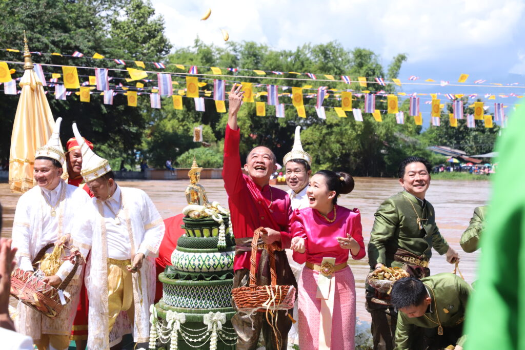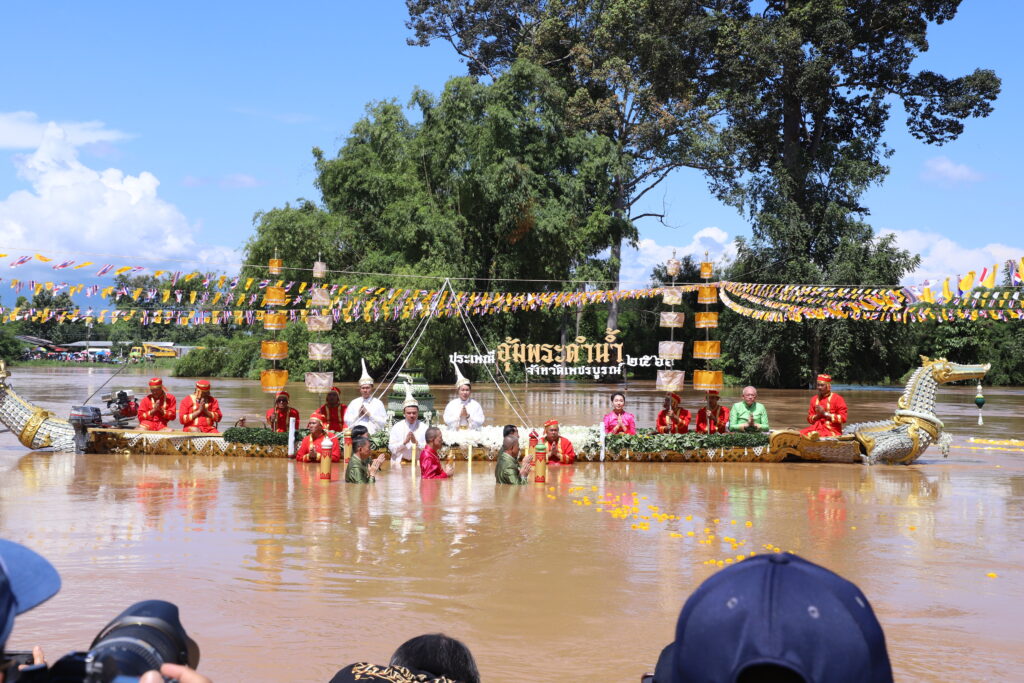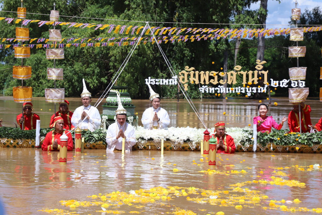 โดยพิธีเริ่มจากนายกฤษณ์ คงเมือง ผู้ว่าราชการจังหวัดเพชรบูรณ์ ได้อัญเชิญพระพุทธมหาธรรมราชาขึ้นประดิษฐานบนเรือ จากวัดไตรภูมิมายังแม่น้ำป่าสัก และแห่องค์พระพุทธมหาธรรมราชาล่องไปตามสายน้ำ ถึงท่าน้ำวัดโบสถ์ชนะมาร เพื่อประกอบพิธี อุ้มพระดำน้ำ ที่ปฏิบัติสืบทอดมานาน และเชื่อกันว่าเป็นพิธีกรรมศักดิ์สิทธิ์อันจะนำความสุข ความสงบร่มเย็นมาสู่เมือง ส่งผลให้ฝนฟ้าตกต้องตามฤดูกาล พืชผลการเกษตรอุดมสมบูรณ์ และทำให้ชาวเพชรบูรณ์มีความเจริญรุ่งเรือง โดยผู้ว่าราชการจังหวัดเพชรบูรณ์ พร้อมด้วยกรมการเมืองทั้ง 4 คือ เวียง วัง คลัง และนา ได้ร่วมกันอุ้มพระดำน้ำจำนวน 6 ครั้ง ครั้งที่หนึ่ง ครั้งที่สอง และครั้งที่สาม ทำพิธีอุ้มในทิศใต้ ครั้งที่สี่ ครั้งที่ห้า และครั้งที่หก ทำพิธีอุ้มในทิศเหนือ ซึ่งภายหลังจากเสร็จพิธี ผู้ว่าราชการจังหวัดเพชรบูรณ์ และผู้ร่วมประกอบพิธี ได้แจกจ่ายเครื่องบวงสรวง กระยาสารท ข้าวต้มลูกโยน กล้วย ที่ผ่านพิธีอันเป็นมงคล ให้ประชาชนและนักท่องเที่ยวที่มาร่วมพิธีนำกลับไปรับประทานเพื่อความเป็นสิริมงคลแก่ตนเอง