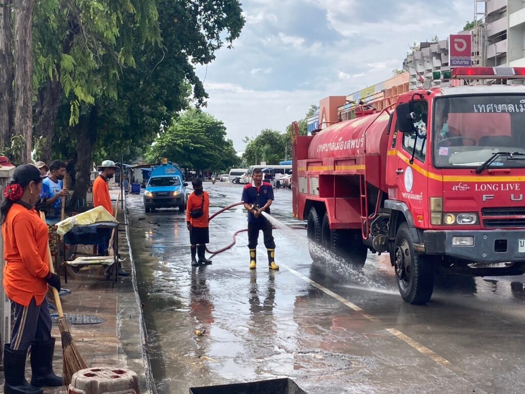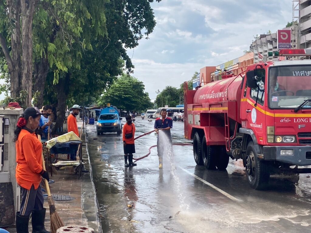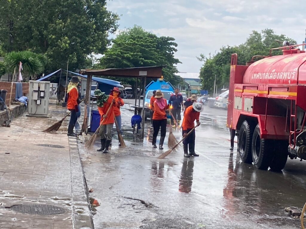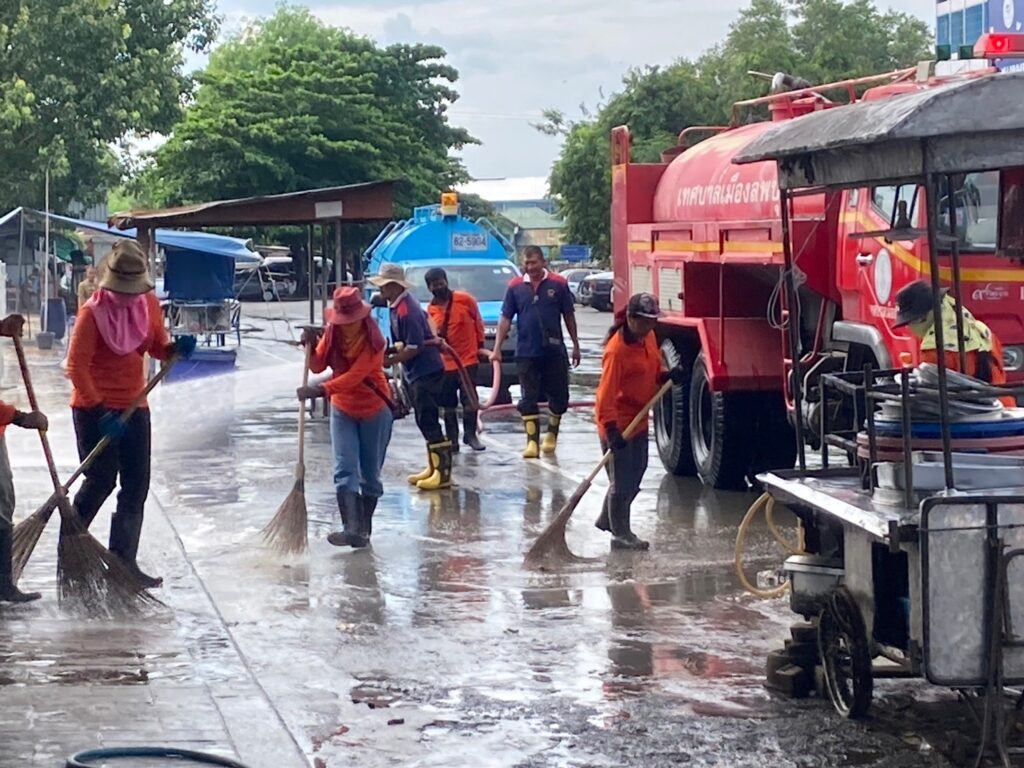 นายจำเริญ สละชีพ นายกเทศมนตรีเมืองลพบุรี ได้สั่งการให้เจ้าหน้าที่กองสาธารณสุขและสิ่งแวดล้อมเทศบาลเมืองลพบุรี และเจ้าหน้าที่งานป้องกันและบรรเทาสาธารณภัยเทศบาลเมืองลพบุรี ดำเนินการล้างทำความสะอาดถนนหน้าพระกาฬ (ตลาดโต้รุ่งริมทางรถไฟ) เพื่อให้เกิดความสะอาด สวยงาม เป็นระเบียบ โดยเจ้าหน้าที่ได้ใช้โซดาไฟเทบนพื้นก่อนที่จะนำรถดับเพลิงฉีดน้ำ และให้เจ้าหน้าที่กวาดทำความสะอาดอีกครั้ง โดยมีการล้างทำความสะอาดพื้น ฟุตบาท และขอบฟุตบาท ตามหลักสุขาภิบาล เพื่อรักษาความสะอาด และความเป็นระเบียบเรียบร้อย รวมทั้งป้องกันการเกิดโรคติดต่อทางเดินอาหาร และขอความร่วมมือจากผู้ประกอบการภายในตลาดโต้รุ่งริมทางรถไฟ (ถนนหน้าพระกาฬ) ในการช่วยกันรักษาความสะอาดและเก็บขยะหลังเลิกขาย