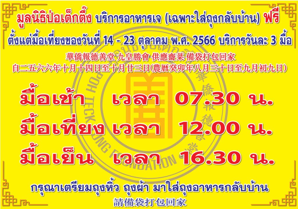 ในช่วงวันที่ 14-23 ตุลาคม 2566 มูลนิธิป่อเต็กตึ๊ง จัดให้มีบริการอาหารเจ [ในรูปแบบบรรจุกล่องกลับบ้าน] แก่ประชาชนฟรี วันละ 3 มื้อ (เช้า กลางวัน และเย็น) โดยเริ่มบริการตั้งแต่มื้อเที่ยงของวันที่ 14 ตุลาคม 2566 เป็นต้นไป นอกจากนี้ ระหว่างวันที่ 13 – 24 ตุลาคม 66 ขอเชิญชวนประชาชนชมอุปรากรจีน (งิ้ว) ที่คณะลูกศิษย์หลวงปู่ไต้ฮงจัดถวายรวม 12 คืน ณ บริเวณฝั่งสำนักงาน มูลนิธิป่อเต็กตึ๊ง พลับพลาไชย กรุงเทพฯ