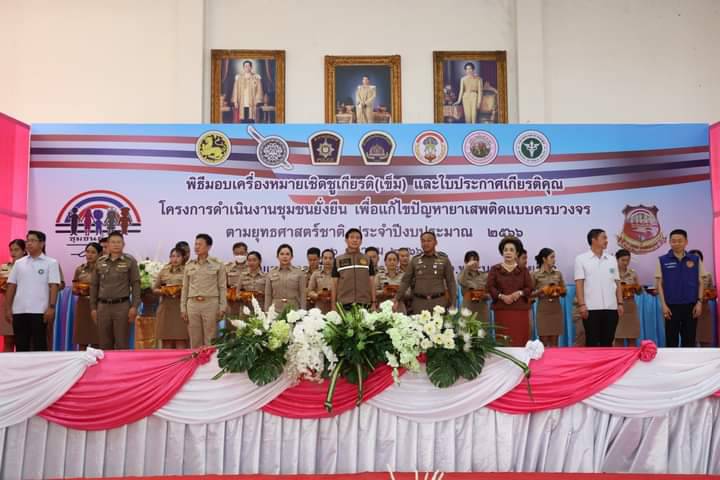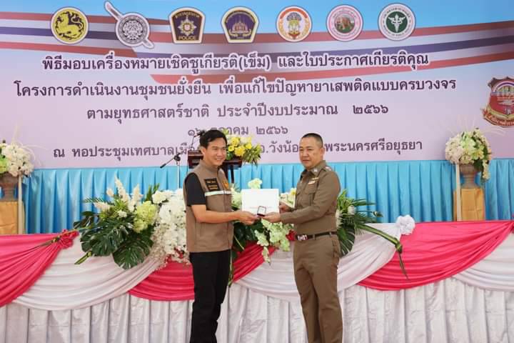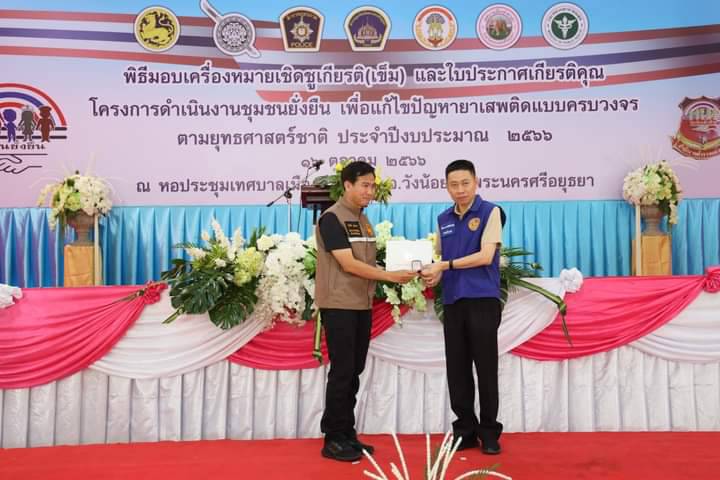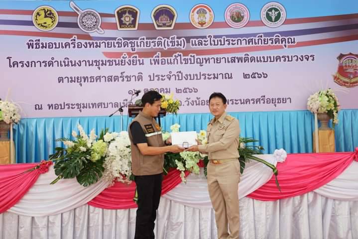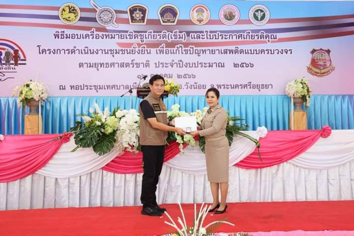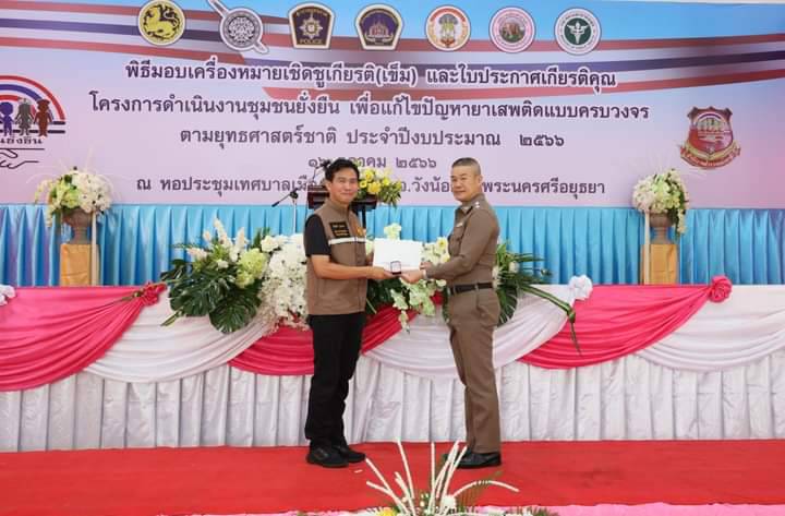 ผู้ว่าราชการจังหวัดพระนครศรีอยุธยา เป็นประธานมอบเครื่องหมายเชิดชูเกียรติ(เข็ม) และใบประกาศเกียรติคุณ ให้กับคณะกรรมการคุ้มและบุคคลผู้มีส่วนร่วมสำคัญในการดำเนินโครงการดำเนินงานชุมชนยั่งยืน เพื่อแก้ไขปัญหายาเสพติดแบบครบวงจรตามยุทธศาสตร์ชาติ ประจำปี 2566