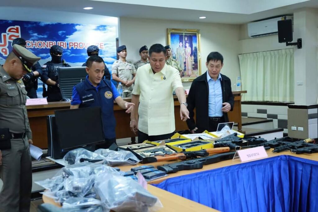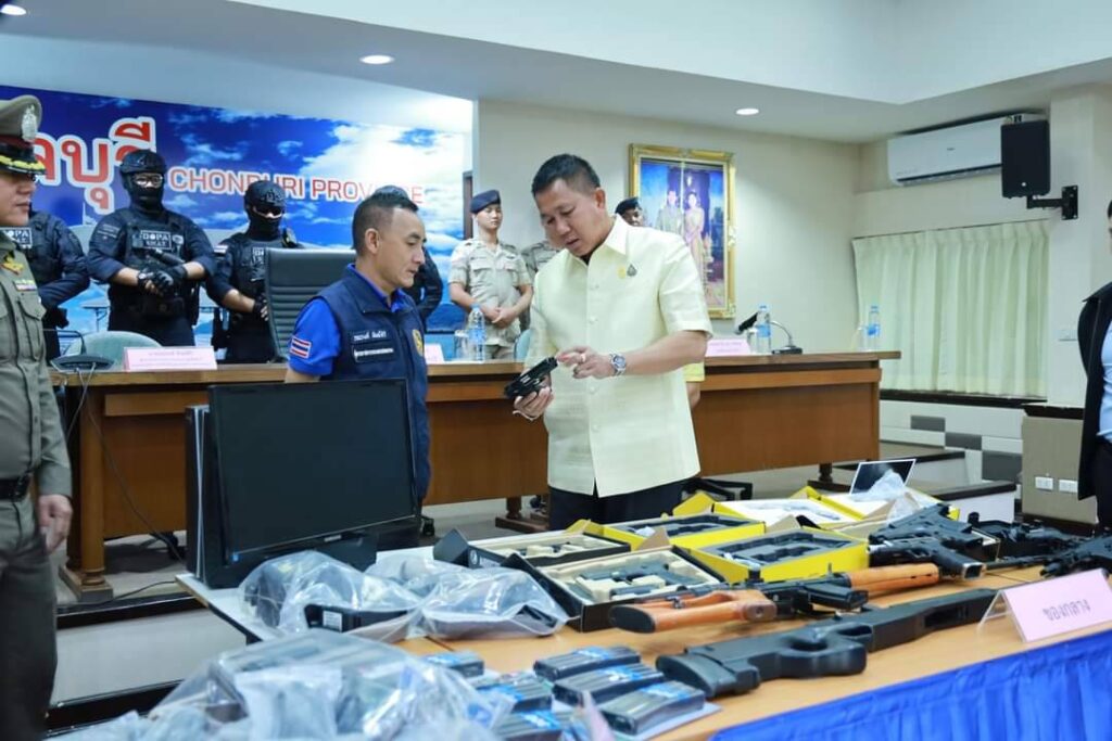 เมื่อวันที่ 17 ตุลาคม 2566 เวลา 16.30 น. ที่ห้องประชุมพระพิพิธโภไคย ชั้น 2 ศาลากลางจังหวัดชลบุรี นายธวัชชัย ศรีทอง ผู้ว่าราชการจังหวัดชลบุรี พร้อมด้วย นายณรงค์ ทิพย์ศิริ ผู้ตรวจราชการกรมการปกครอง นายชัยพรแพภิรมย์รัตน์ ปลัดจังหวัดชลบุรี นายสมศักดิ์ จุฑาวงศ์สกุล นายอำเภอบ้านบึง พ.ต.อ.สมชาย ทิวงศา ผู้กำกับการสถานีตำรวจภูธรบ้านบึง และชุดปฏิบัติการพิเศษ ร่วมกันแถลง ผลการปฏิบัติงานของชุดปฏิบัติการ ตรวจค้น จับกุม นายคุณากร นิรมนรัตน์ เจ้าของร้าน bbgun smileairsolf บ้านบึงชลบุรี ตั้งอยู่เลขที่ 68/6 หมู่ 5 ตำบลหนองบอนแดง อำเภอบ้านบึง จังหวัดชลบุรี และเป็นผู้ครอบครองใบ ป.5 หรือใบอนุญาตให้ทำประกอบซ่อมแซมหรือจำหน่ายอาวุธปืนหรือเครื่องกระสุนปืนสำหรับการค้า ที่ทางร้านปืนบีบีกัน มีการลงโฆษณาในช่องทางออนไลน์แพลตฟอร์มต่างๆโดยมีการลงนามใบอนุญาตโดยนางอาภรณ์ ใหม่มงคล อดีตนายอำเภอบ้านบึง แต่พบความผิดปกติเพราะลงวันที่ก่อนหน้านายอำเภอจะมารับตำแหน่งเป็นเวลา 1 เดือน อีกทั้งพบพิรุธหลายจุด ทั้งการปลอมแปลงลายเซ็น การใช้ตราปั๊มสิงห์ที่ไม่ใช่ตราสิงห์ของอำเภอบ้านบึง เจ้าหน้าที่ชุดปฏิบัติการพิเศษจึงเข้าตรวจสอบ จับกุม พร้อมยึดของกลาง ซึ่งประกอบไปด้วย อาวุธปืนพร้อมเครื่องกระสุนปืนหลายขนาด ปืนบีบีกัน สิ่งเทียมอาวุธปืน และหลักฐานการปลอมแปลงเอกสารราชการ ซึ่งเป็นความผิดอาญาและต้องได้รับโทษตามกฎหมาย โดยผู้ต้องหาให้การยอมรับสารภาพพร้อมนำตัวส่งดำเนินคดี ตามนโยบายของรัฐบาล ในการควบคุมครอบครองและการพกพาอาวุธปืนเครื่องกระสุนปืนและสิ่งเทียมปืน เพื่อสร้างความปลอดภัยให้กับพี่น้องประชาชน เนื่องจากที่ผ่านมาประชาชนทั่วไปสามารถเข้าถึงอาวุธปืนได้ง่ายผ่านทางโซเชียลมีเดียอีกทั้งยังน่าห่วงคือมีการนำเอาสิ่งเทียมอาวุธปืนไปปรับเปลี่ยนแก้ไขดัดแปลงให้เป็นอาวุธปืนสามารถใช้ยิงกระสุนจริงทำอันตรายต่อชีวิตร่างกายของผู้อื่นได้