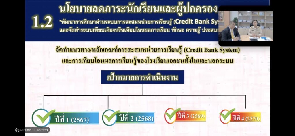 2) นโยบายลดภาระนักเรียนและผู้ปกครอง พัฒนาการศึกษาผ่านระบบการสะสมหน่วยการเรียนรู้ (Credit Bank System) และจัดทำระบบเทียบเคียงหรือเทียบโอนผลการเรียน ทักษะ ความรู้ ประสบการณ์ หรือสมรรถนะ ของโรงเรียนเอกชนทั้งในระบบและนอกระบบ