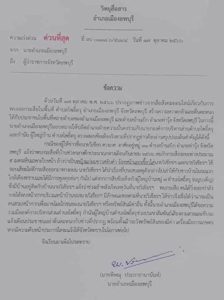 ล่าสุดผู้ใช้เฟซบุ๊ก “Sathaporn Auyha” ได้แจ้งในกลุ่ม “แจ้งเหตุลพบุรี” โดยเป็นเอกสารที่นายพิษณุ ประภาธานานันท์ นายอำเภอเมืองลพบุรี แจ้งต่อผู้ว่าราชการจังหวัดลพบุรี โดยมีข้อความว่า ด้วยวันที่ 17 ตุลาคม 2566 ปรากฎภาพข่าวจากสื่อสังคมออนไลน์เกี่ยวกับการพบเจอกระสื่อในพื้นที่ ต.โพธิ์ตรุ อ.เมืองสพบุรี จ.ลพบุรี สร้างความหวาดกลัวและตื่นตะหนก ให้กับประชาชนในพื้นที่หลายตำบลของ อ.เมืองสพบุรี และต.บ้านเบิก อ.ทำวุ้ง จ.ลพบุรี